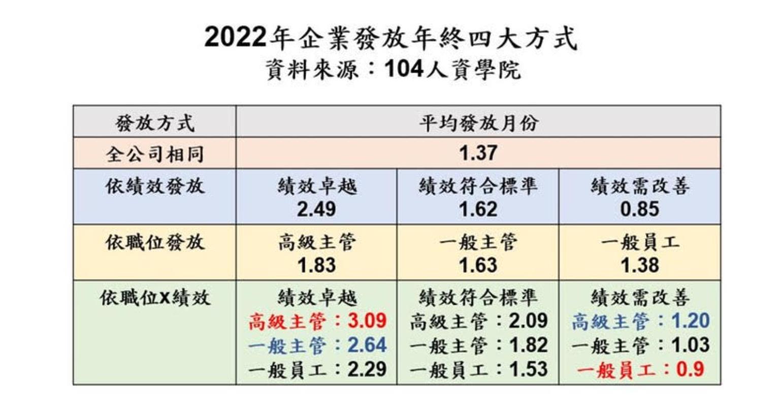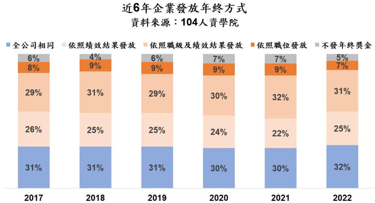 104人資學院的《2022~2023薪資福利調查報告》,於 2022年7月18日到10月14日針對企業人資及用人主管進行網路問卷調查,共計1017家企業參加,涵蓋全市場213個職務代表薪資。其中,關於企業發放年終獎金的方式,觀察如下: