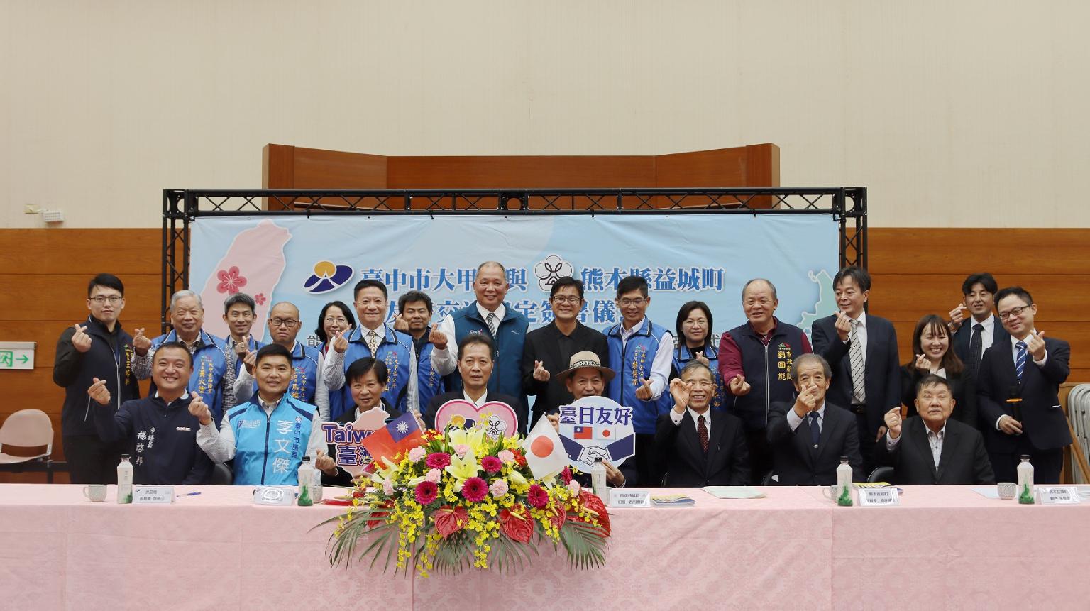 深化台日經濟、觀光、物產及防災應變等互惠交流,台中市大甲區與日本熊本縣益城町9日在大甲區公所締盟,由大甲區長顏金源及益城町長西村博則共同簽署友好交流協定書並互贈締盟禮物。台中市政府民政局副局長徐照山代表市長盧秀燕出席見證,期盼透過交流延續及加深台日各領域互動,促進彼此繁榮發展、共榮共好。
