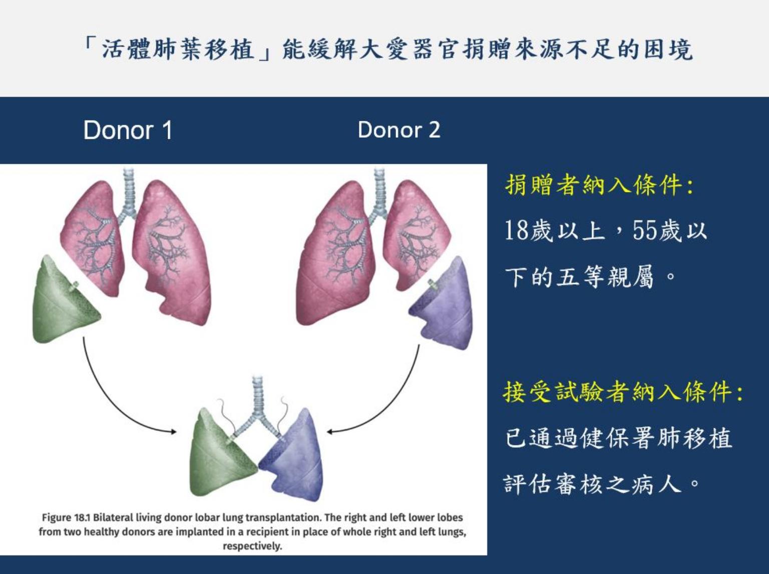 活體肺移植需2位血型相容、五等親屬,各捐贈一側下肺葉