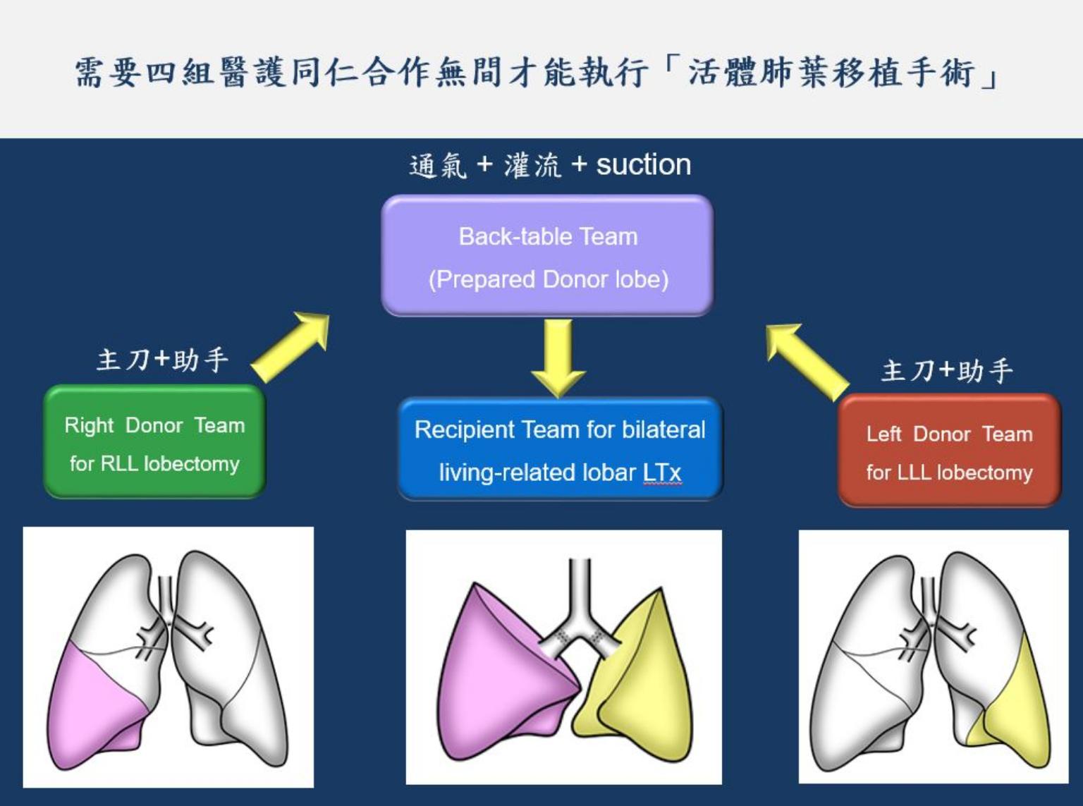 徐紹勛也指出,活體肺葉移植手術跟肝臟、腎臟不同的地方在於,需有2位血型相容的18歲以上、55歲以下五等親屬,無償各捐贈一側的下肺葉,且捐贈者的體型與肺功能皆須達到捐贈的標準、須有4組醫護團隊同時執行手術。