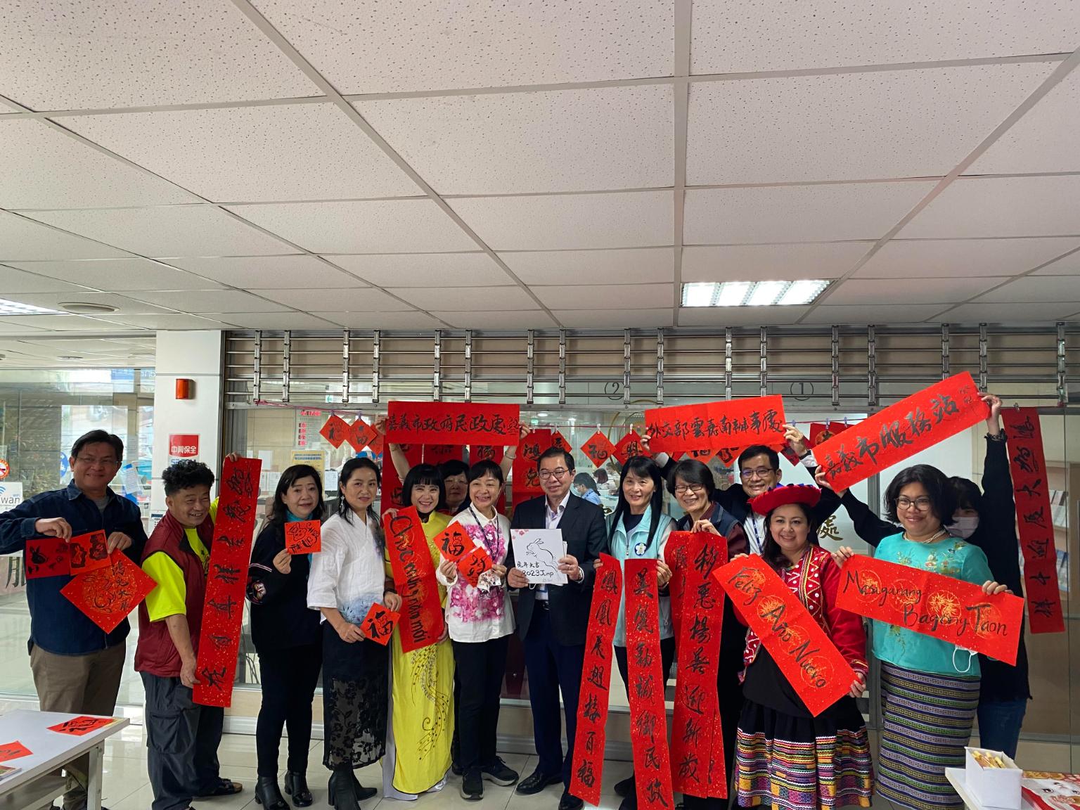 為迎接農曆年節的到來,外交部雲嘉南辦事處、內政部移民署南區事務大隊嘉義市服務站及嘉義市政府民政處共同舉辦「112年玉兔迎春贈春聯」活動。新上任的行政院雲嘉南聯合服務中心李碧菁副執行長亦出席獻上新年祝福。書法家王宏隆、申婷頡以及漫畫家詹皓凱於外交部雲嘉南辦事處大廳入口與新住民朋友一起寫春聯並分送洽公民眾,現場春節氣氛濃厚,喜氣洋洋。