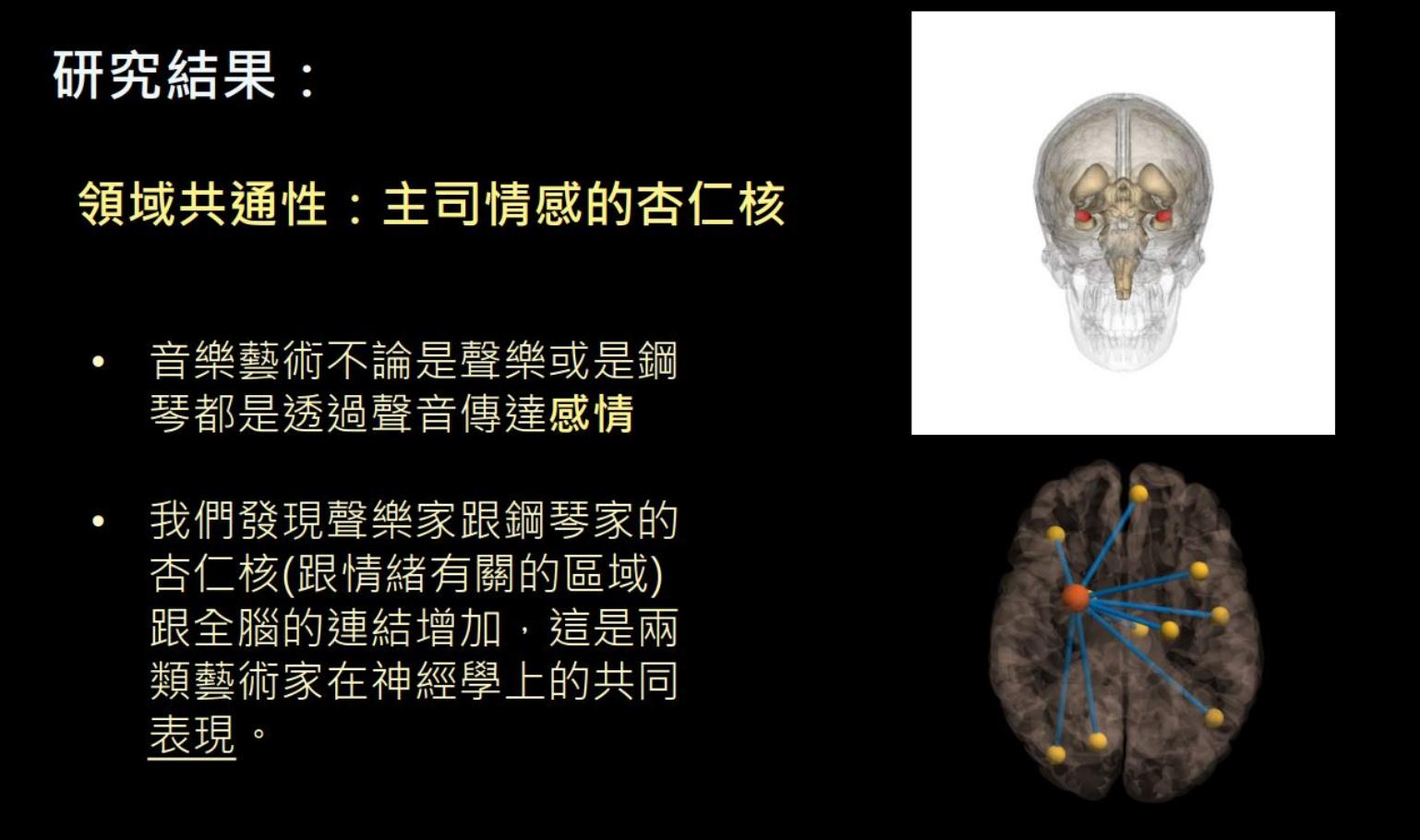 他最後也總結,「本研究證實不同音樂型態的學習與訓練,可分別強化不同功能的神經網絡,研究發現除了提供藝術人才專業教育與訓練的神經科學基礎之外,更提供對神經損傷或精神心理創傷的病人,施予藝術治療與音樂治療(藝術處方)的神經科學基礎。」