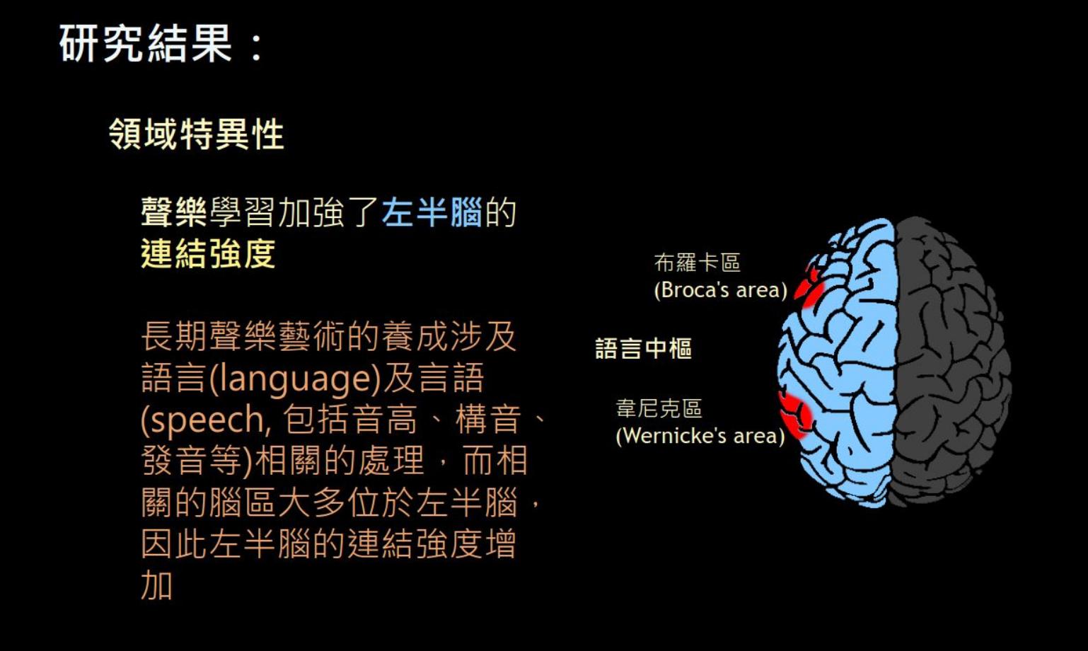 謝仁俊說明,「這些發現反映了不同音樂藝術形態的領域特異性,聲樂家透過語言與言語的相關功能腦區來呈現音樂,而鋼琴家則透過雙手,來控制琴鍵呈現音樂,因為比聲樂家需要更多的左手精細控制,才會增強右腦的連結。」