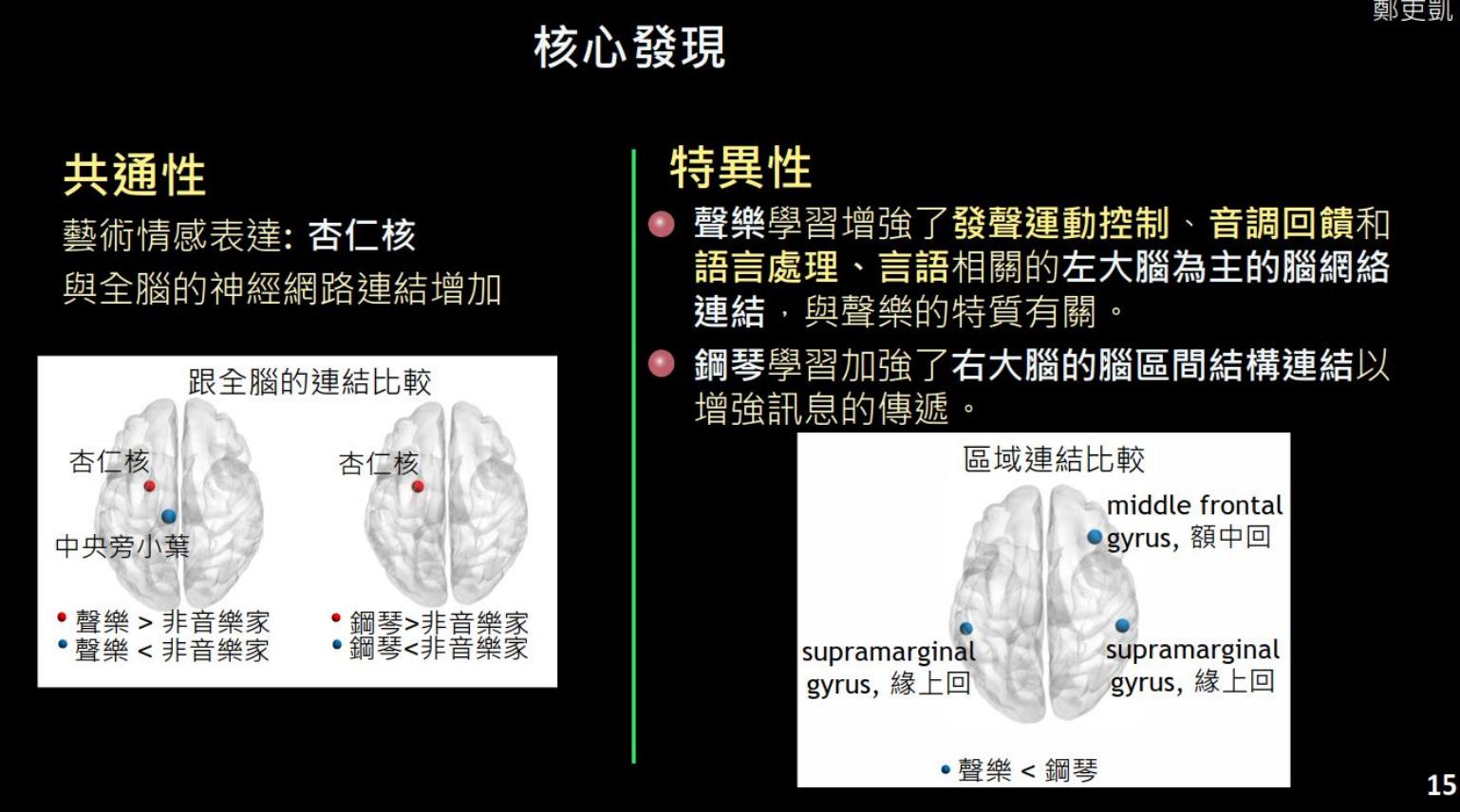 鄭吏凱指出,比較聲樂家與鋼琴家之間,發現聲樂家的左半腦神經連結密度較高,鋼琴家則右半腦的神經傳遞效率較高,「因為歌唱比鋼琴需要更多與語言優勢腦左半腦相關的功能處理,而鋼琴家需要精確的手指運作,以操控複雜的琴鍵。」