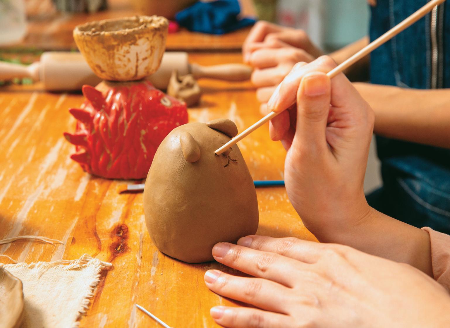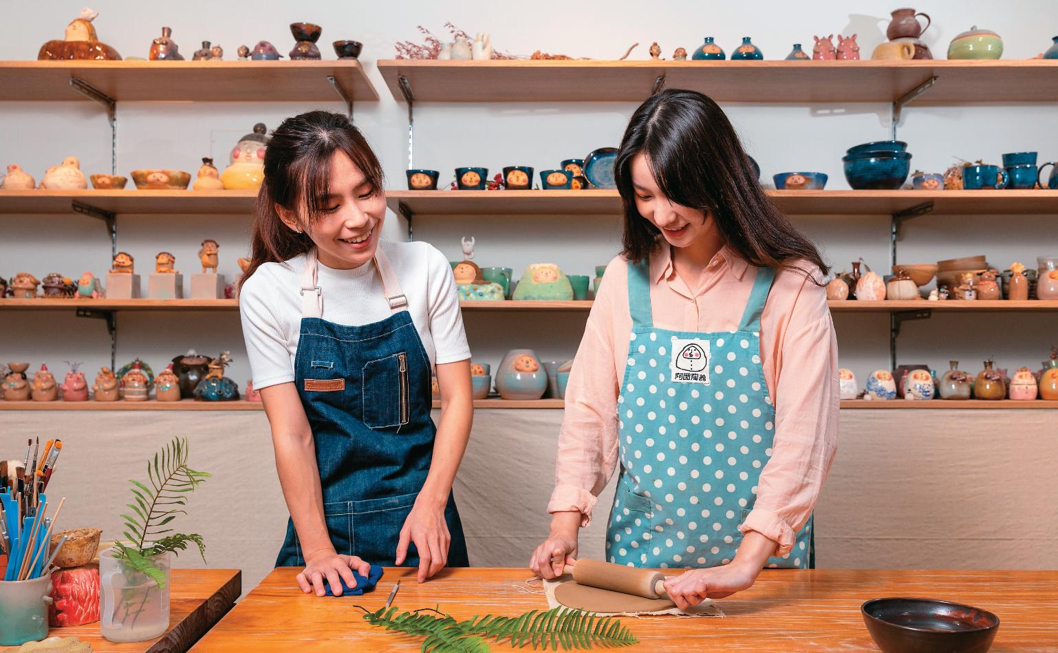 用完早餐,滿懷朝氣地學習新事物,在「阿囡陶器」亭惠老師的帶領下享受捏陶的樂趣,隨著雙手的力道搓圓捏扁,一點一點地塑造出心中的構想,彷彿重回孩提時代的無憂感受,這也是亭惠將工作室取名「阿囡」(囡,台語語意為「孩子」)的原因。