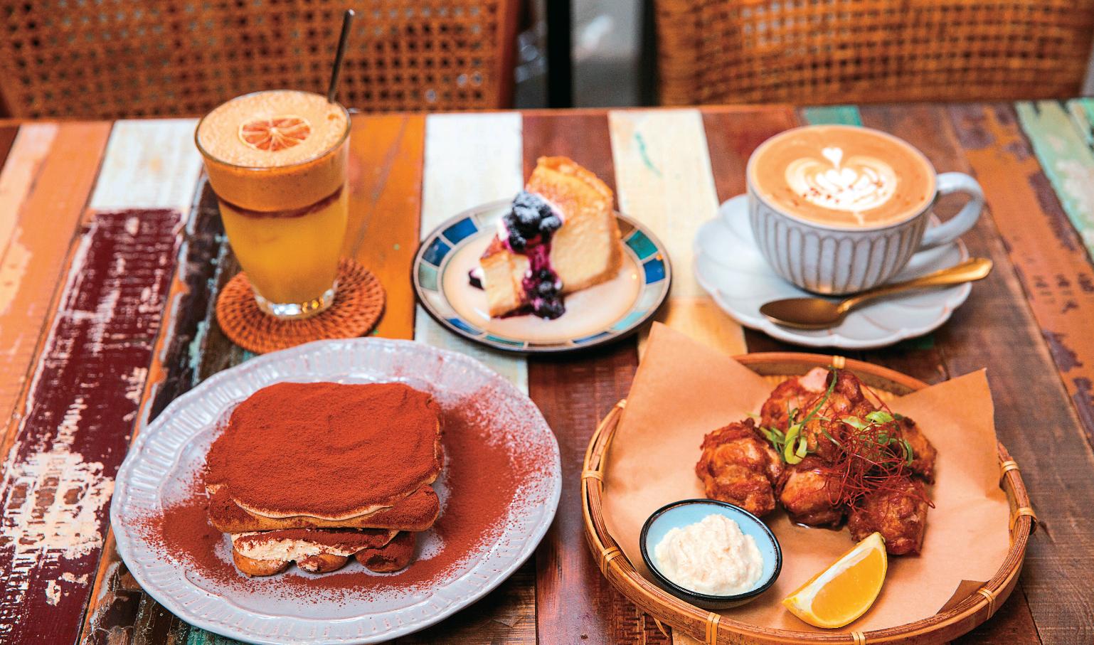 拾午的菜單也是Vivi以古早台灣為題所設計,擅長廚藝的她不論是研發抑或製作都親力親為。從開胃菜到主餐的食材組合豐盛,輕食、甜點及飲品亦可見待客的誠摯心意。自製的「藍莓芝士蛋糕」是優格、奶油乳酪和檸檬的清爽搭配,再淋上醇郁的自製藍莓醬,微酸口感與乳酪的濃厚完美平衡;飲品首推兩款咖啡特調:靈感取自西西里咖啡的「拾橙午」及花香幽微的「桂花拿鐵」,果香、花香與咖啡的絕妙交融縈繞於鼻腔久難消散。逐年淡去的年味,隨著懷舊氛圍與鄰桌長輩的談笑再度鮮明,新年度等待展開的新計畫也因此有了頭緒。