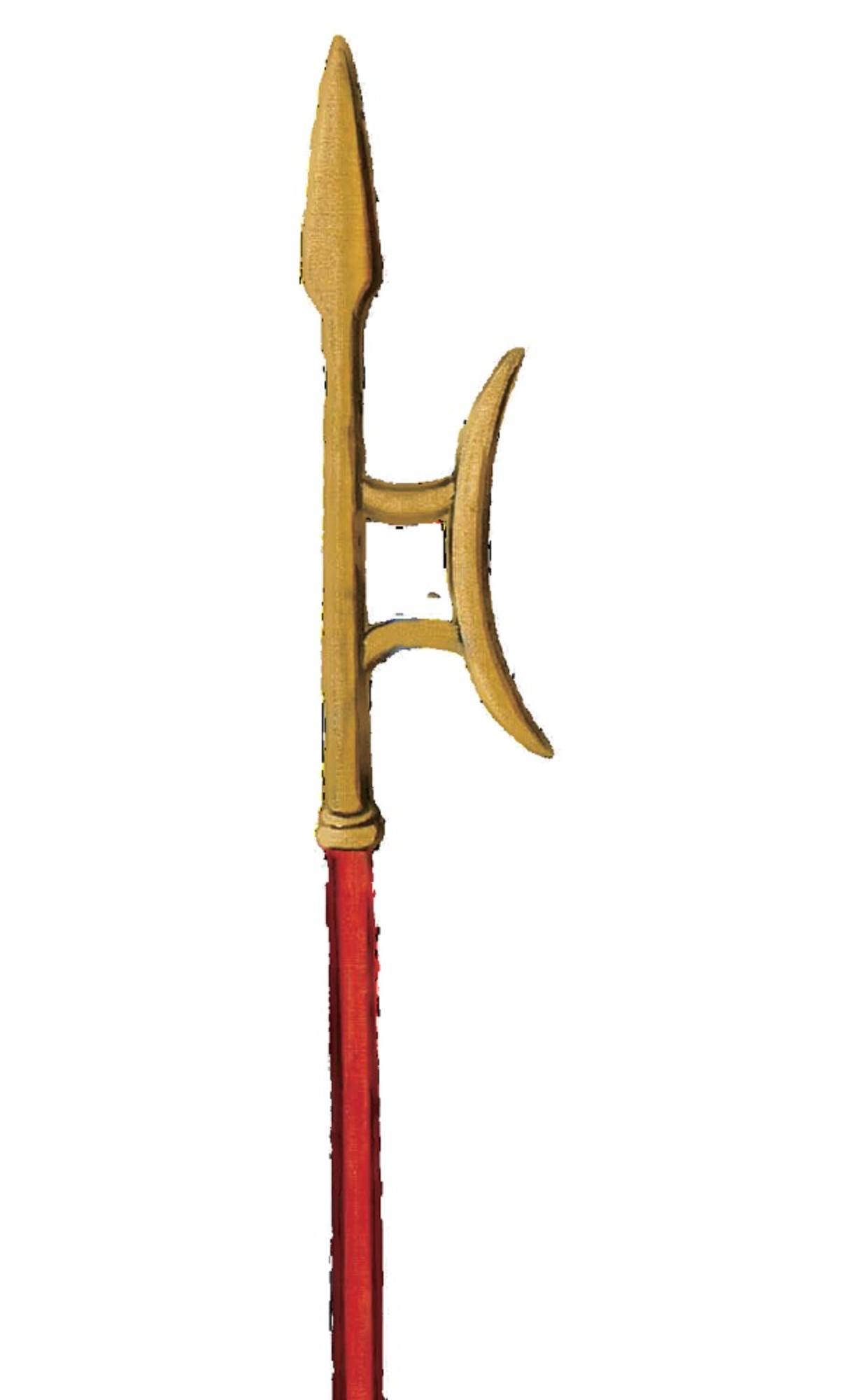 3. 伸出食指、中指像戟一樣指人,叫作戟指,表示憤怒或勇武的情狀。戟是一種古代兵器,長柄一端裝有槍尖,旁邊附有月牙形鋒刃。