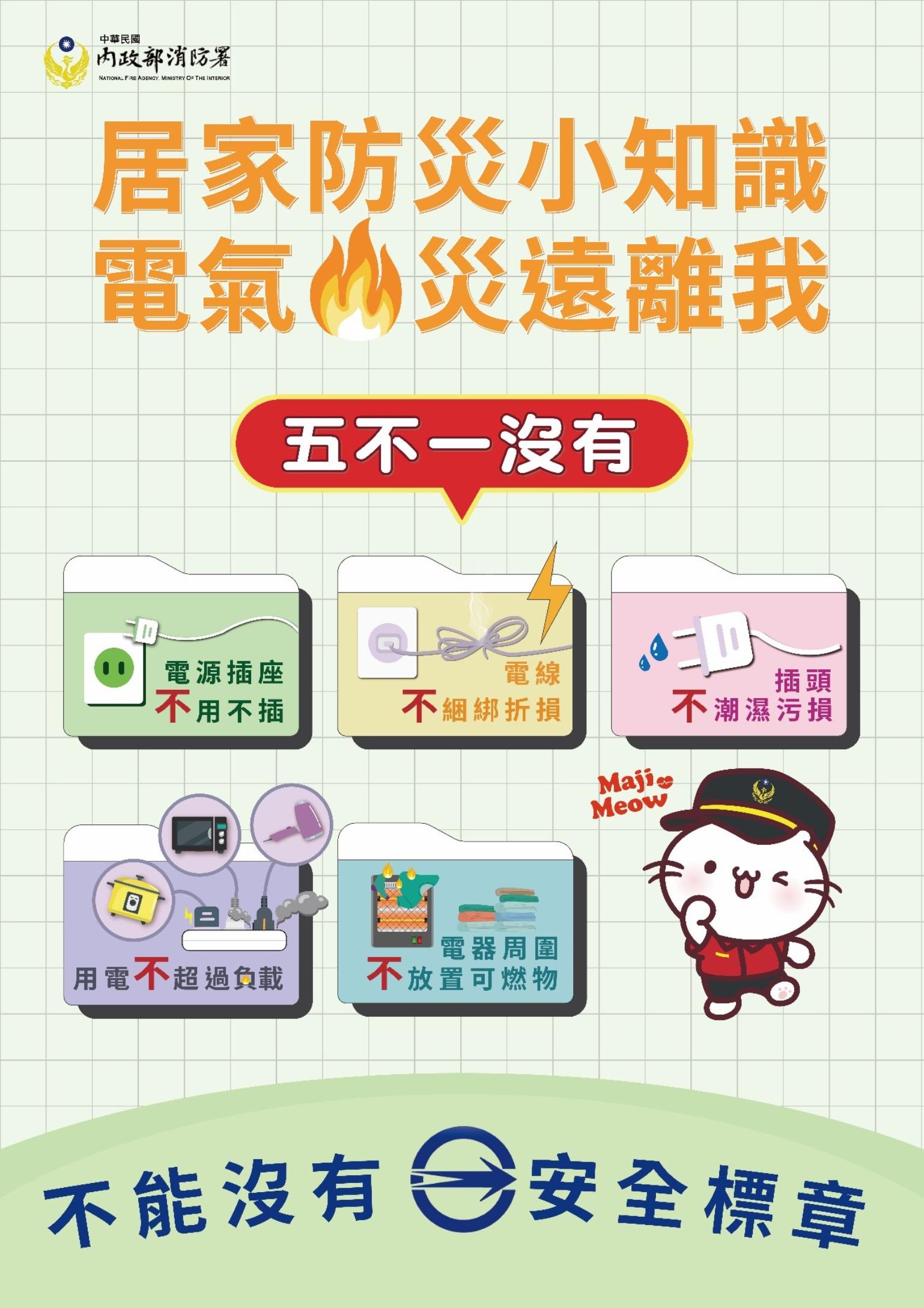 另外,用電務必做到「五不一沒有」,電源插座不用不插、電線不綑綁折損、插頭不潮溼汙損、用電不超過負載、電器周圍不放可燃物,以及沒有安全標章的電器不要使用,平時應定期檢查臥室、客廳及廚房等大量用電處所的安全,防範電氣火災。