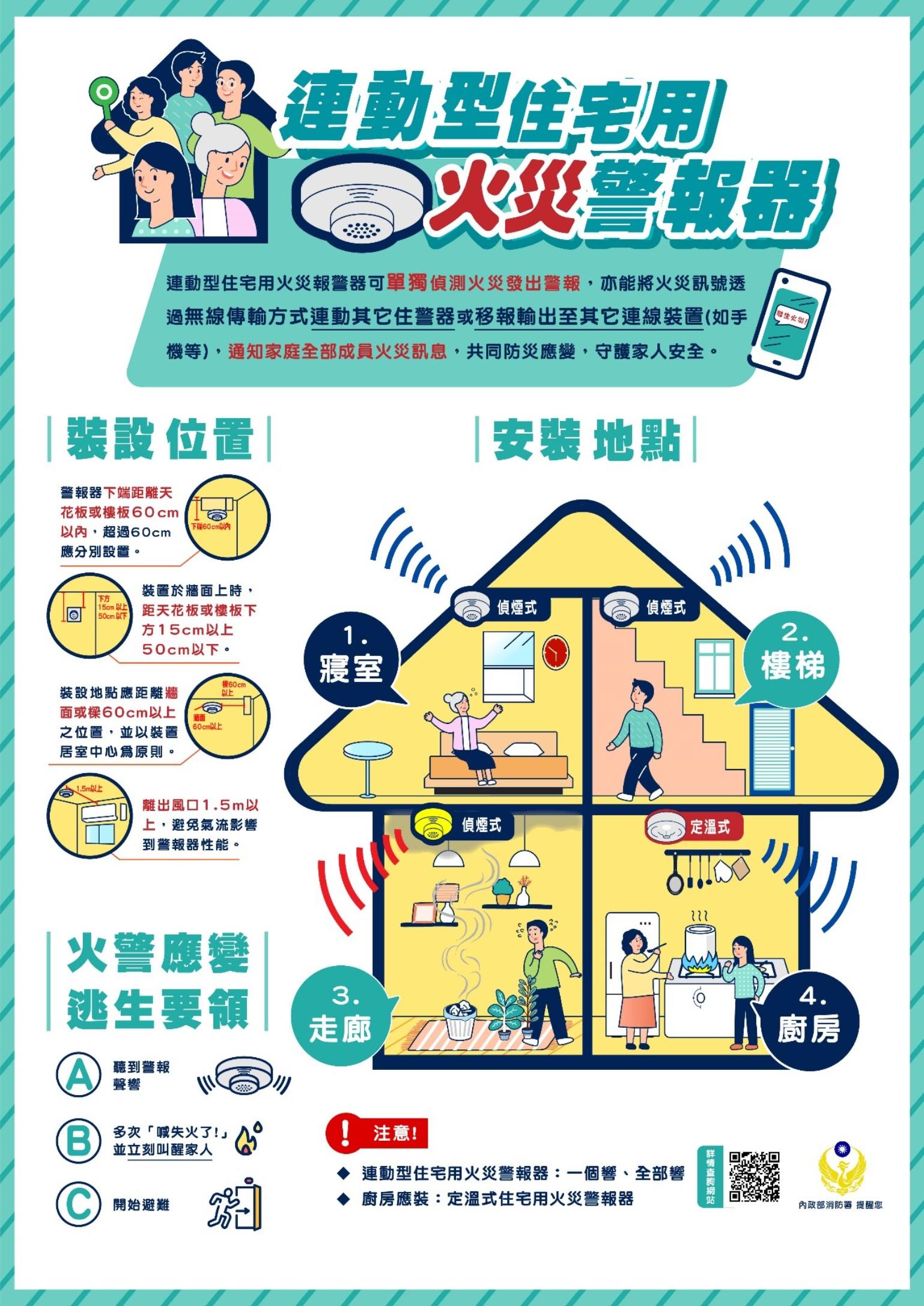 內政部強調,住家裝設「連動型住宅用火災警報器」,可在火災發生初期偵測濃煙或高溫,同步於安裝該警報器的所有住宅空間發出高分貝火災警報,可即早警示家庭全部成員,爭取滅火或避難的時間;呼籲國人安裝住宅用火災警報器,一起守護居家安全。