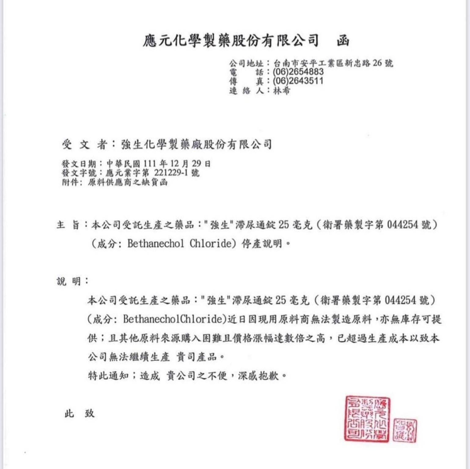 19日沈采穎再指出,「現在乙醯胺酚調劑1000粒裝、抗生素(Amoxicillin)都缺貨!還有強生滯尿通錠25毫克(Bethanechol)廠商也發函告知因現用原料商無法製造原料、也無庫存可提供,且其他原料來源購入困難、價格漲幅達數倍之高,已超過生產成本,故公司無法繼續生產此產品。」