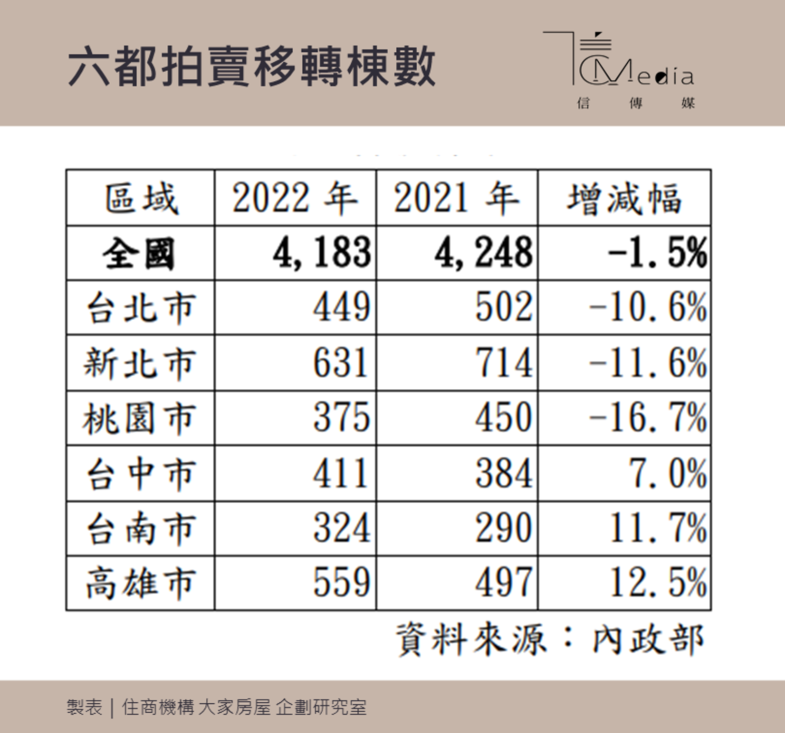 內政部今日公布2022年全台建物拍賣移轉棟數,交易量合計4,183棟,較去年量縮1.5%;而且六都呈現南北兩樣情,中南三都慘淡、北三都穩健,顯示房價有一波爆漲的台中、台南、高雄熱度漸退, 已經有持有人不堪壓力,房屋被迫拍賣。