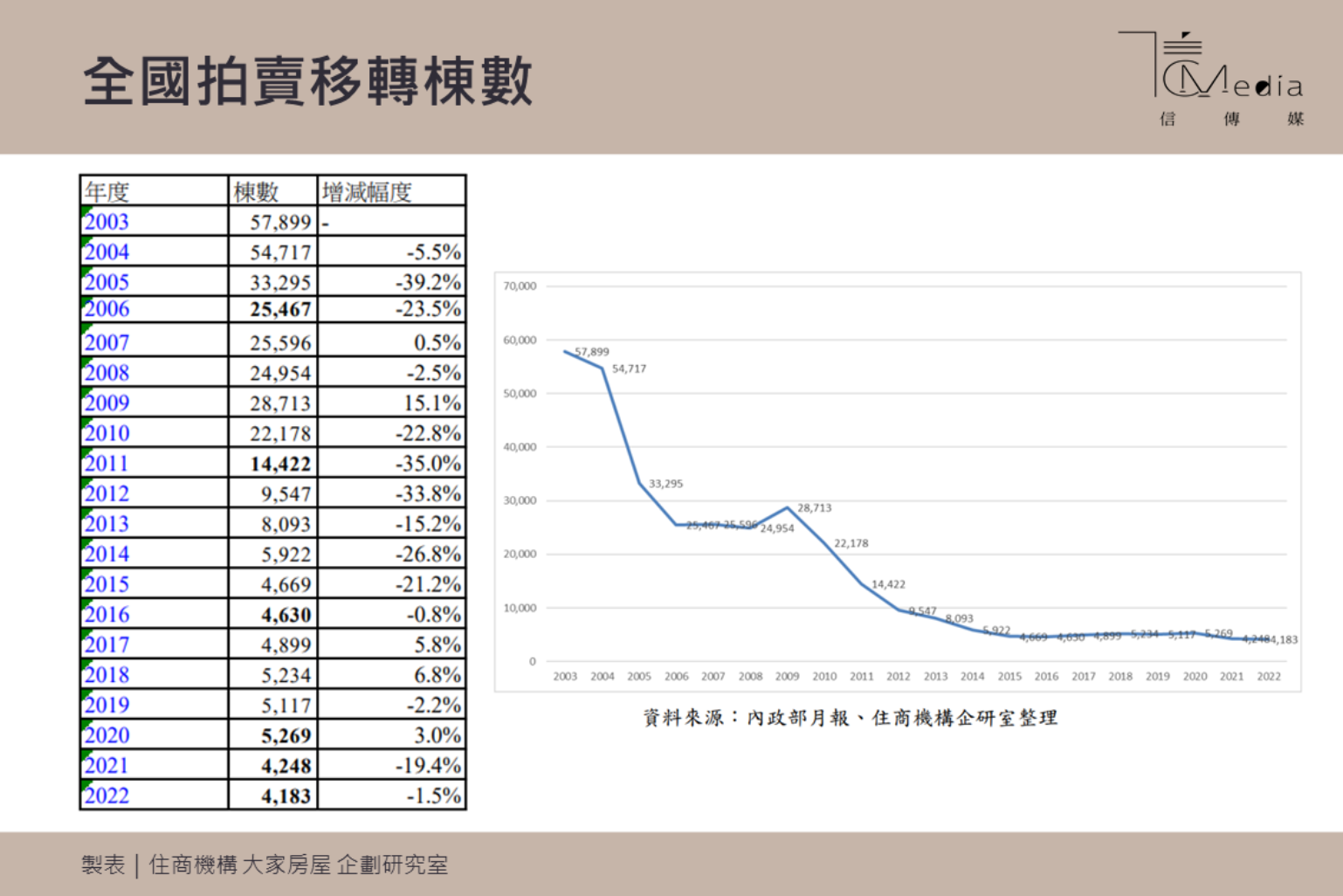 大家房屋企劃研究室副理郎美囡指出,去年央行啟動升息循環增加房貸負擔,成交量緊縮,房市交易來到6年新低,但過去「法拍量」往往是房市空頭重要指標,而今不增反減,意味著房價飆漲後,屋主只要願意降價,多數還能在成屋市場中解除燃眉之急。
