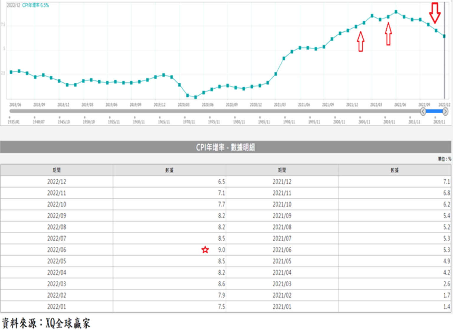 12月消費者物價指數年增率自11月的7.1%下降至6.5%,與市場預期的6.5%相符,月減0.1%,低於11月的0.1%,亦低於市場預期的月增0%,為消費者物價指數兩年半以來首次月增率呈現負數;12月核心CPI年增率自11月的6.0%下降至5.7%、月增0.3%,與市場預期相符。12月PCE物價指數年增率下降至5.0%、核心PCE物價指數年增率下降至4.4%。通膨數據處於持續降溫趨勢之中。