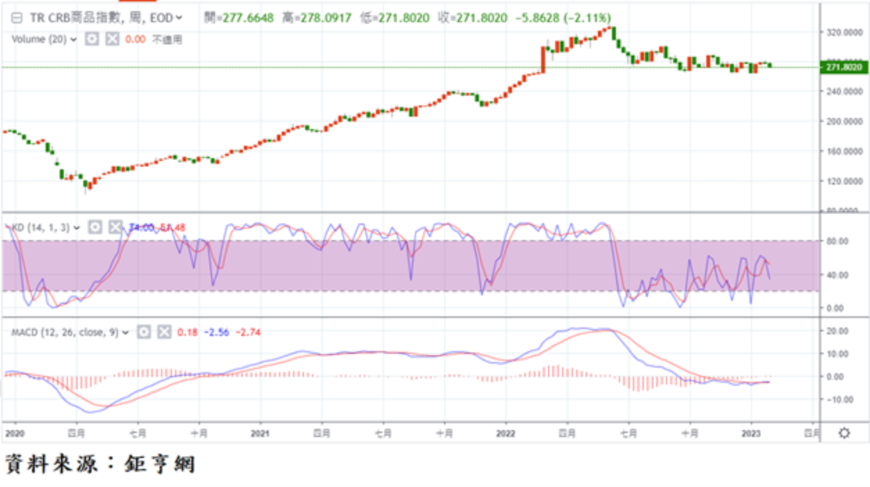 美國物價指數年增率持續下降,除因基期墊高導致年增率下降外,代表大宗商品原物料價格走勢的CRB指數,自2022年6月高點329.59點下跌,至2023年2月上旬為271.8點,雖仍處於相對高檔區,但並未再明顯攀高,顯示在主要經濟體製造業景氣同步下行之下,大宗商品原物料需求力量並不強,此有利於上游生產者物價指數下降,舒緩終端消費市場的通膨壓力。