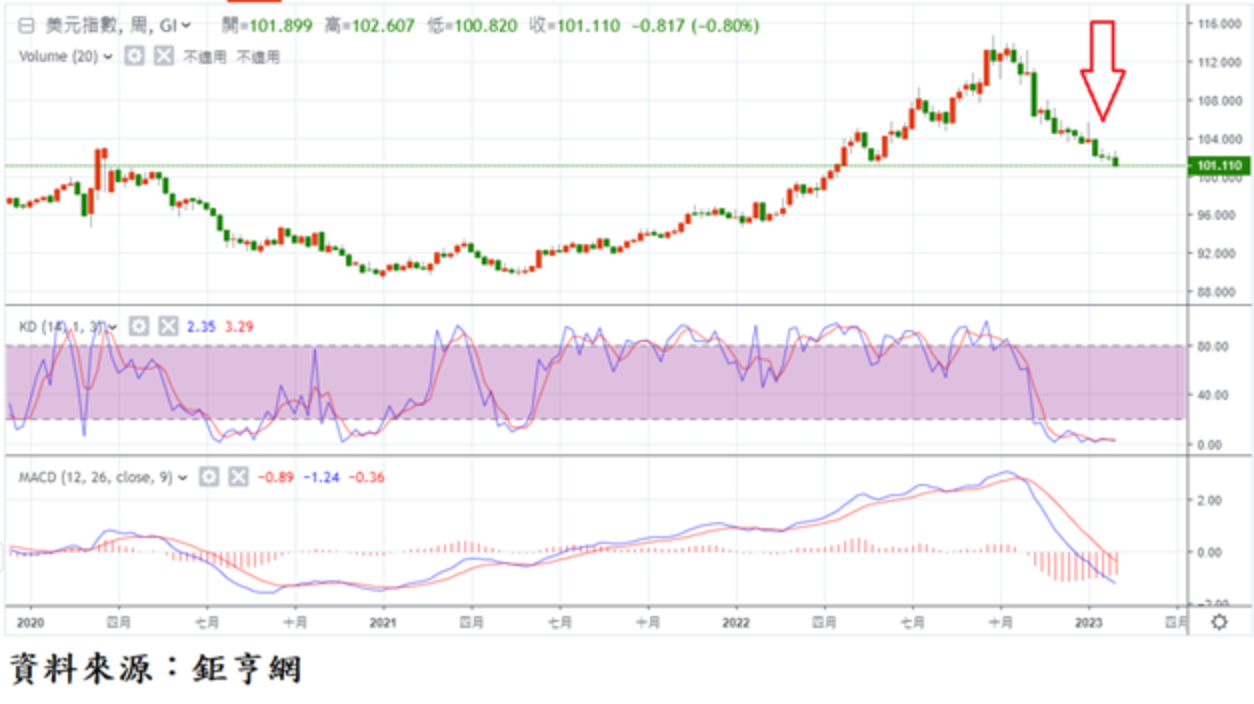 美元指數自2022年9月創下114.778高點後,至2月上旬已連續5個月下滑,美元指數若跌落100點的頭部頸線位置,可能是另一波跌勢的開始。