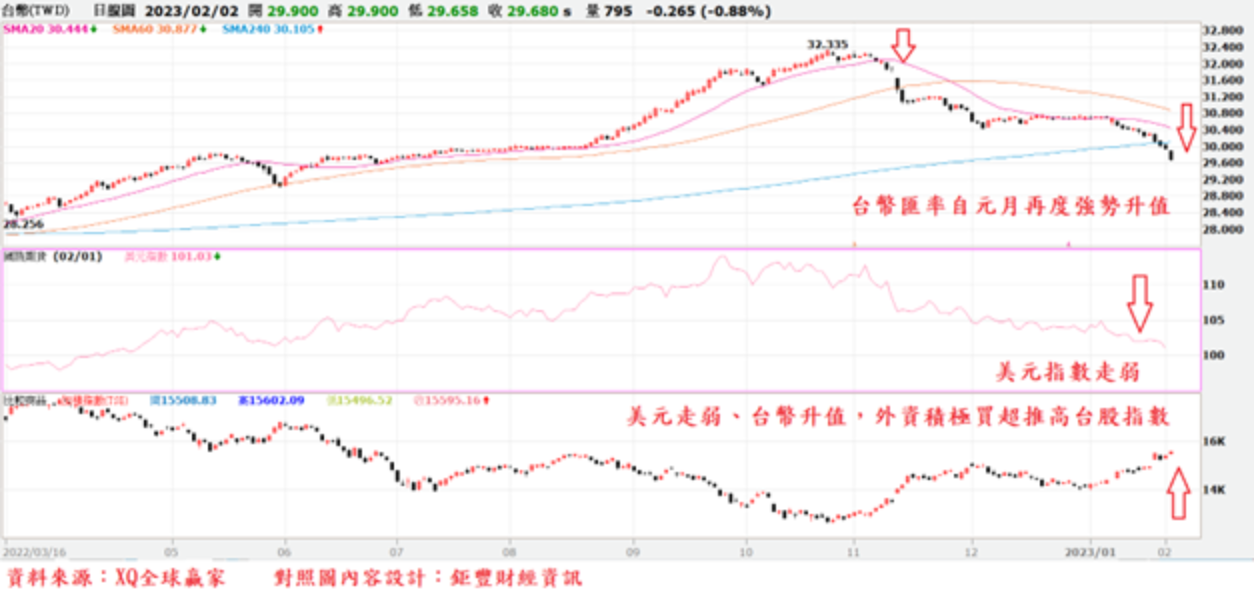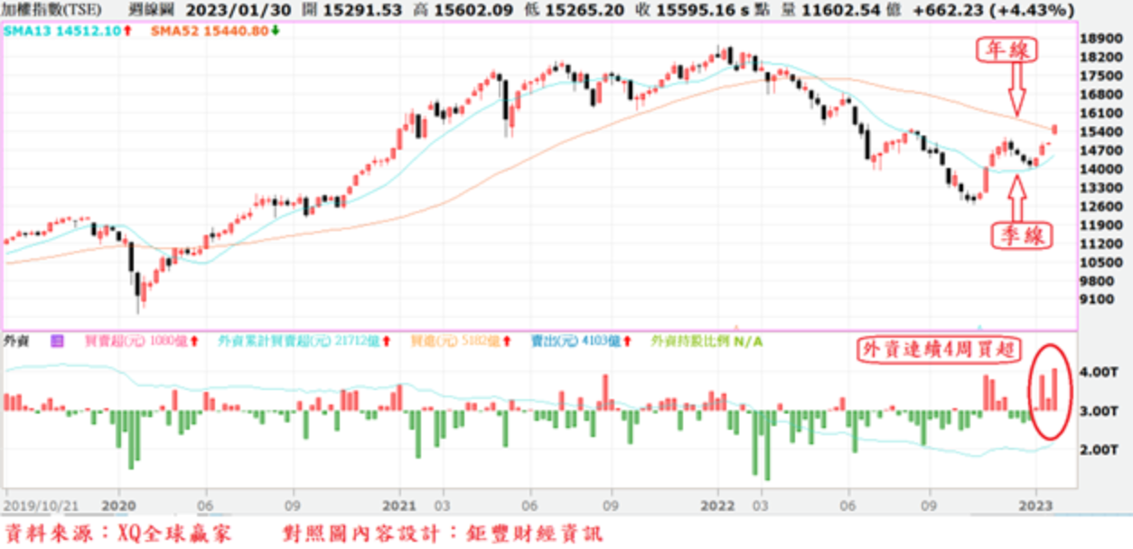 台股兔年開紅盤後的四個交易日,累計上漲662點、漲幅4.43%,外資更大幅買超1080億,呈現連續四周買超。外資2023年1月買超2007億,創下2005年12月後最大單月買超額度,成為台股指數單月上漲7.98%最大力量。至2月2日止,台股收盤指數15595點,不僅鞏固穩定上揚的季線(60日均線)趨勢,更一舉突破下降中的年線(240日均線)15349點,為2022年4月指數跌破年線之後,首度重回年線之上。