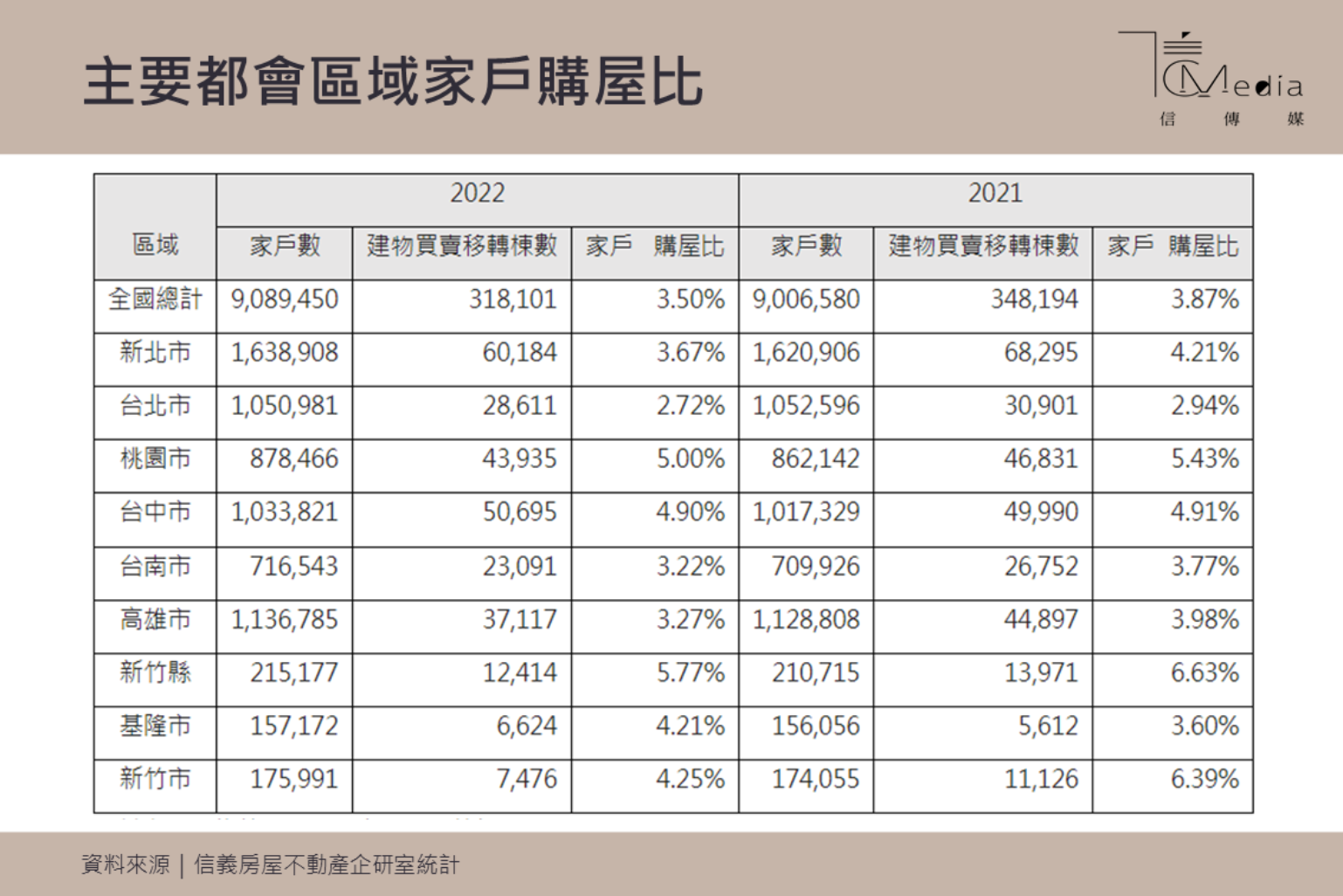 信義房屋不動產企研室專案經理曾敬德指出,從2022年買賣移轉衰退與家戶持續增加,大概就可嗅出2022年家庭買氣出現明顯衰退的味道,若就區域來看,最有活力的還是桃、竹與台中市,每百戶家庭購屋比例高於其他都會區,主要原因包括就業機會多、人口結構年輕,區域裡面有更多的自用需求帶動。