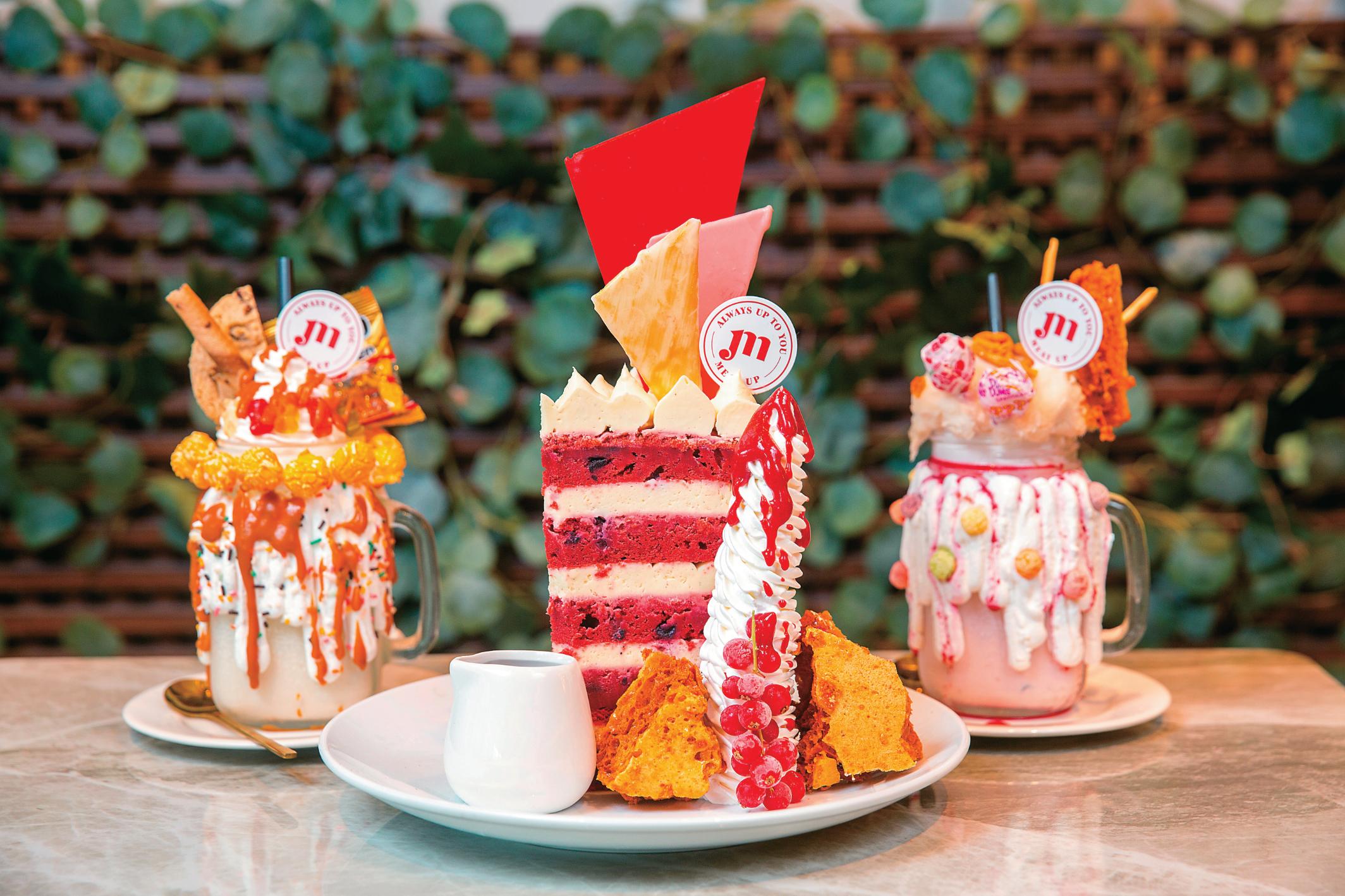 浮誇系餐點的特色是擁有大量繽紛色彩,因此配色、擺飾、細節都要透過不斷測試才能上桌。店長Allen提到,餐點樣式在定案前,一定會經過多角度拍照確認外觀,接著再擺放一段時間,模擬上餐之後客人先拍後食的情境,「等到客人拍完,餐點依舊沒有變形,才算合格。」以人氣不墜的常駐飲品「草莓奶昔」為例,上層依序為不易變形的焦糖脆片、棉花糖、棒棒糖,外緣運用餅乾脆片、固狀鮮奶油來製造視覺效果。此外,為了不讓口感過於甜膩,奶昔打入新鮮草莓汁,以酸香來平衡甜味,使得風味溫柔又順口。