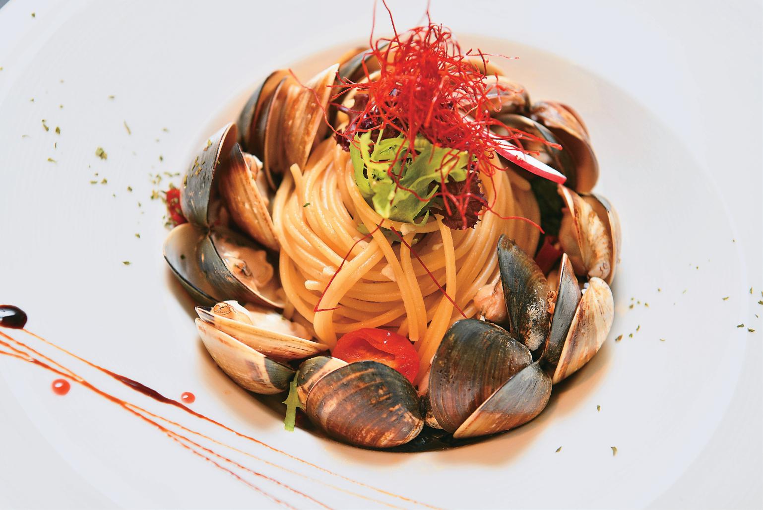 另一道「蒜辣白酒蛤蠣義大利麵」是與鮮味直球對決的餐點,開殼蛤蠣像花瓣般層層簇擁著麵體,光視覺就令人覺得心花怒放。主廚首先加入蛤蠣與蒜頭、辣椒、白酒,以及來自復興區的椴木香菇一同爆香,再透過鍋氣將食材的豐富風味匯聚於麵條裡,清鮮的滋味直教人一口接一口。