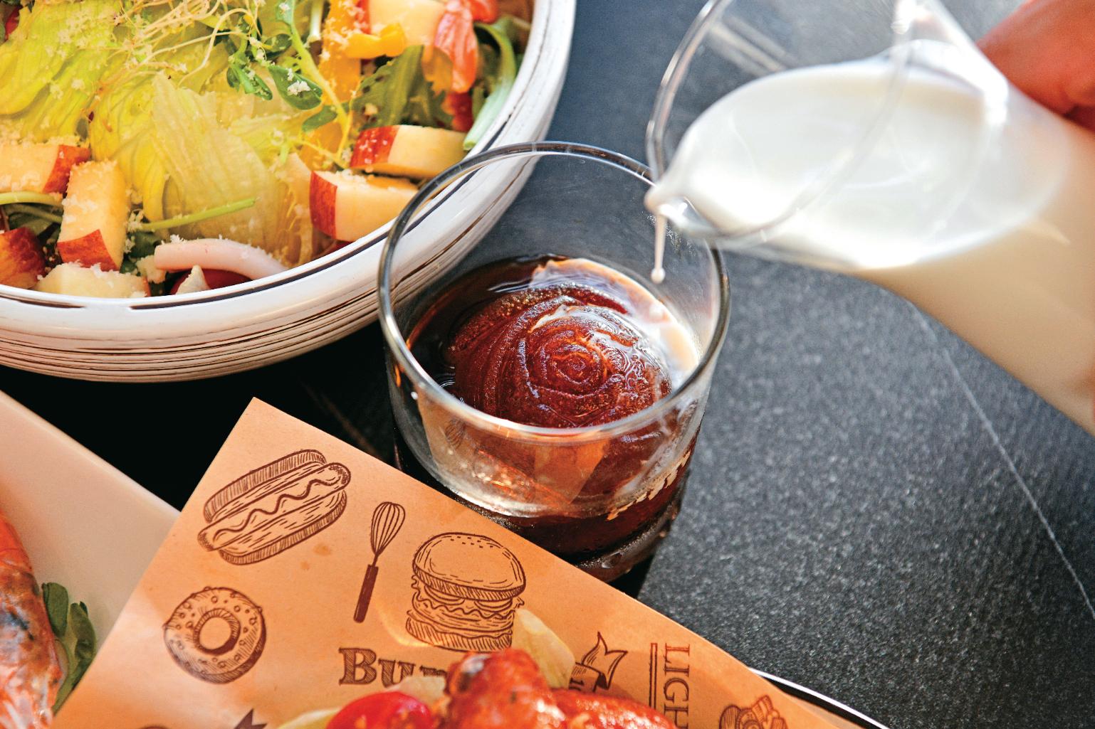 隱花園的賣點不只是景觀與主餐,飲品也具巧思,與景觀相互搭襯最合拍的風景。從品飲威士忌後發想出的「冰鑽鮮乳拿鐵」,以削成玫瑰花外型的冰滴咖啡鑽為基底,倒入鮮乳之後,會激發出淡雅的桂圓香,視覺優雅、口感芳醇。劉昱賢特別提及冰滴咖啡鑽製作不易,需要滴製4小時後,再送入冷藏熟成3天,最後才能結冰成型,美好的事物值得等待。