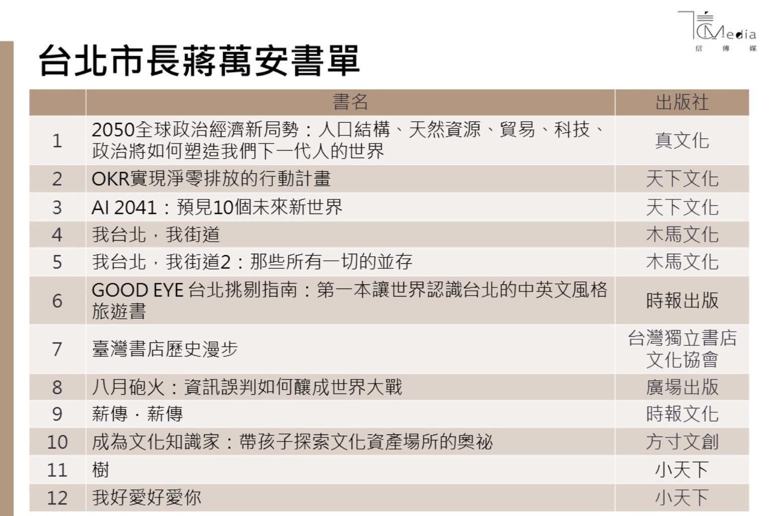 而剛成為三寶爸的台北市長蔣萬安,分享的書單特別挑選了兩本童書,分別為樹木圖文書《樹》及硬頁寶寶書的經典之作《我真的好愛你》,還有可以親子共同閱讀的《成為文化知識家:帶孩子探索文化資產場所的奧祕》。