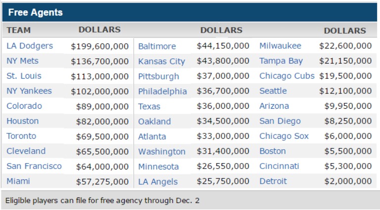 大聯盟自從結束1994年大罷工,勞資雙方達成了新的CBA後,就開始實施豪華稅,洋基一直是豪華稅貢獻的大戶,洋基這幾年由第二代接班後,不再像老喬治那般為了世界大賽冠軍可以無限制花錢,只是,東扣西省始終無法將團隊薪資壓縮在上限之內,去年鐵爺(Mark Teixeira)退休,若再加上今年A-Rod與沙胖(CC Sabathia)兩人合起來4500萬美元薪資將空出來。