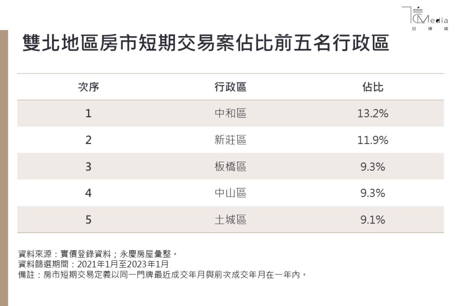 進一步分析雙北地區房市短期交易的分布,中和區佔比13.2%最多,其次為新莊區11.9%,接著依序為,中山區(9.3%)、板橋區(9.3%)、土城區(9.1%)。陳賜傑指出,上述五個行政區都位屬雙北人口稠密處、交通也便捷,居住需求暢旺、房市交易熱絡,可能造成房市短期交易近半數都集中在這五個區域,有意於此處購售屋的民眾,勢必要更加小心。