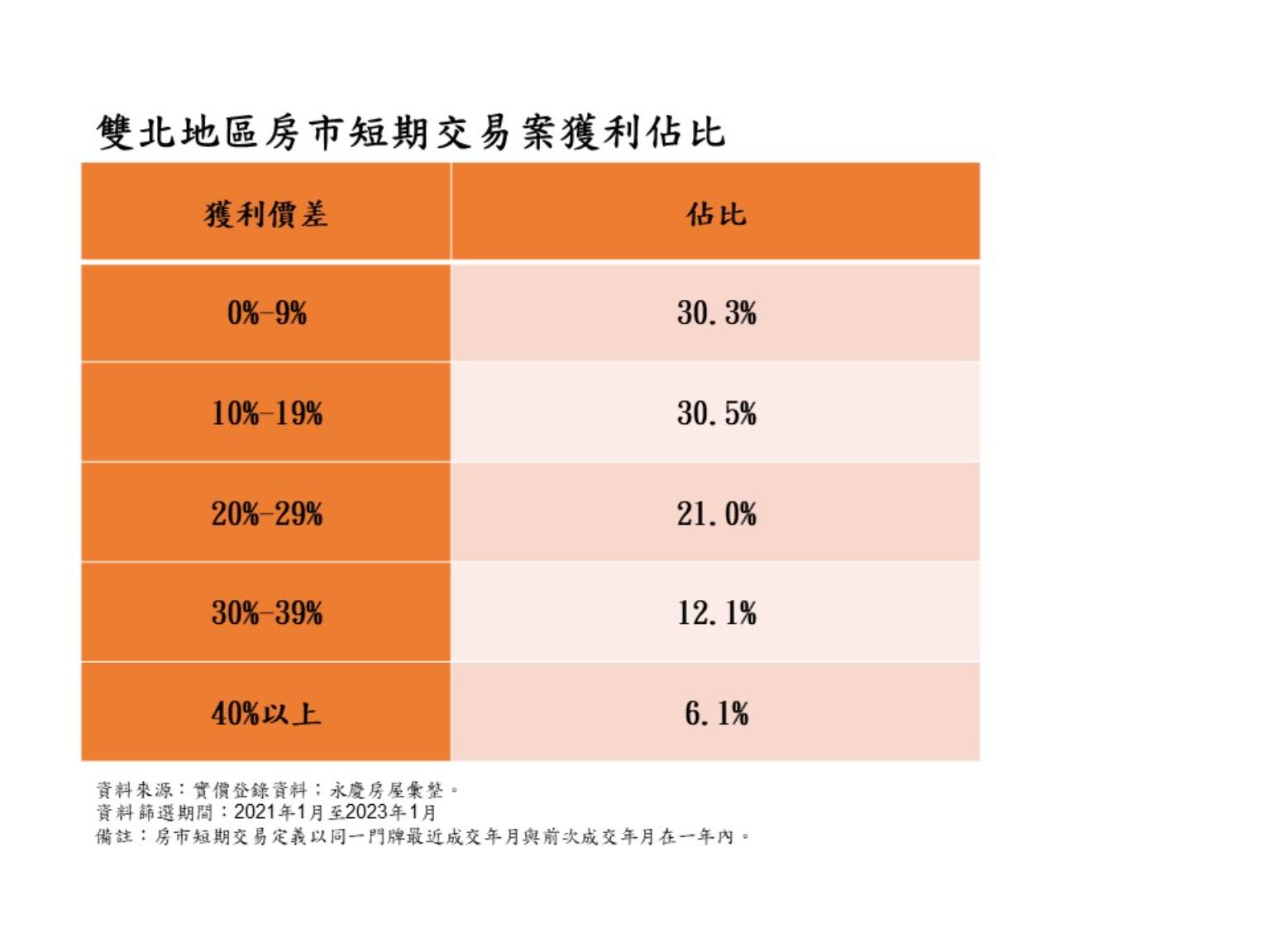 從永慶房屋根據實價登錄資料統計進一步細看,這些持有不到1年內便轉售的案件中,不乏有獲利300、400萬以上的案例,價差令人咋舌。永慶房屋業管部協理陳賜傑表示,根據15.3%的漲幅計算,在雙北地區若是原本2000萬的房子,經由投機客購入轉手,下一手買家可能就要額外付出超過300萬元的差價。300萬的差價即使對雙薪家庭而言,也可能是好幾年的年收入。