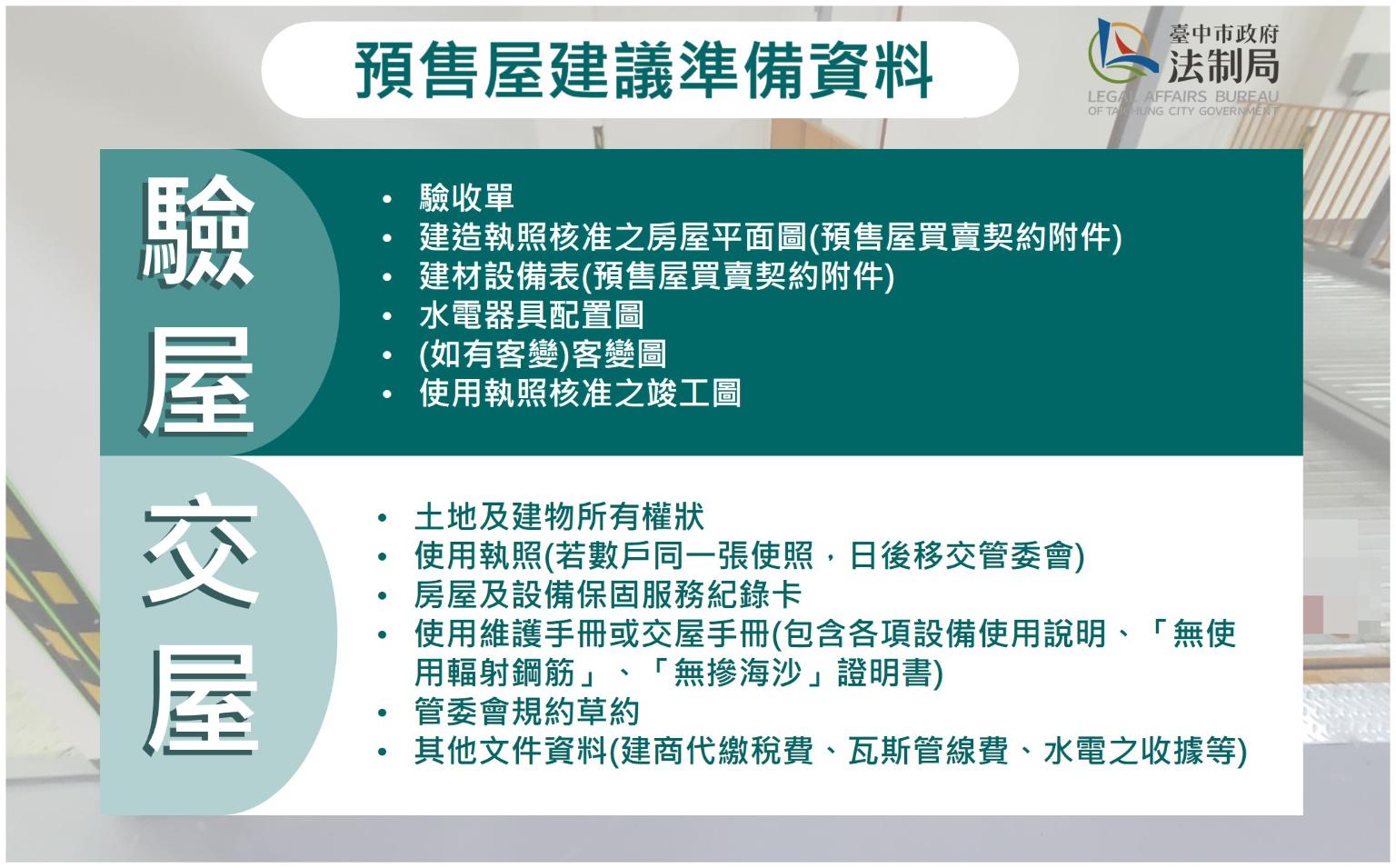 台中市政府法制局表示,由於預售屋興建期程需要一段時間,到驗屋、交屋時,購屋民眾才能目睹未來新家實況,消保官提醒消費者於交屋前,一定要先驗屋,並記得向建商索取驗收單、房屋平面圖、建材設備表及水電器具配置圖等圖說文件,才能據以核對預售屋是否具備契約約定的品質,保障自身權益。