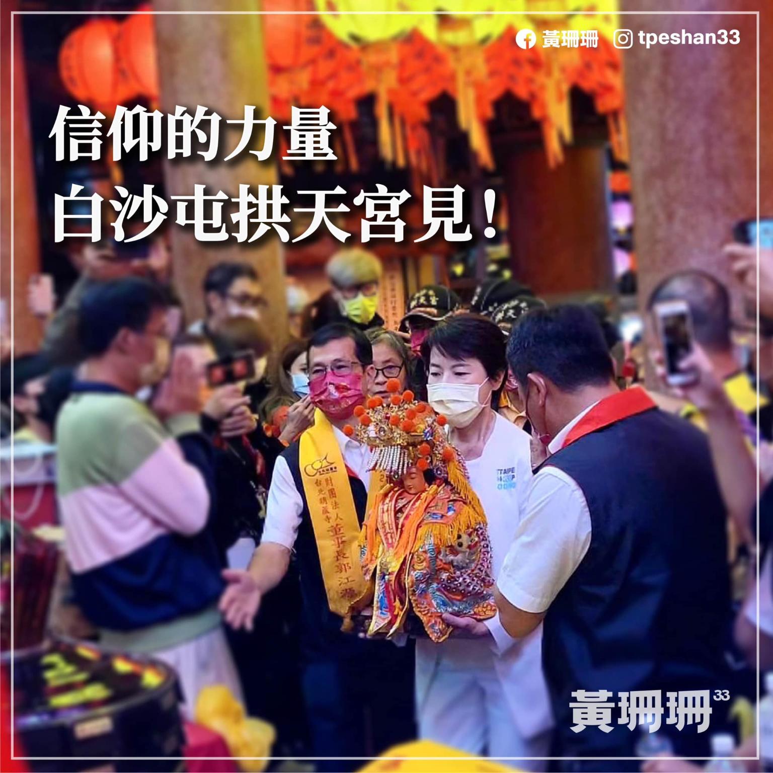 台灣民眾黨主席柯文哲全程隨行白沙屯媽祖,今日結束進香行程,前台北市長黃珊珊上午也前往合體,體驗一日香燈腳;黨內人士評估,就選舉戰略而言,黃珊珊目前最佳的戰鬥位置,就是加入民眾黨和不分區立委名單,協助衝刺政黨票。