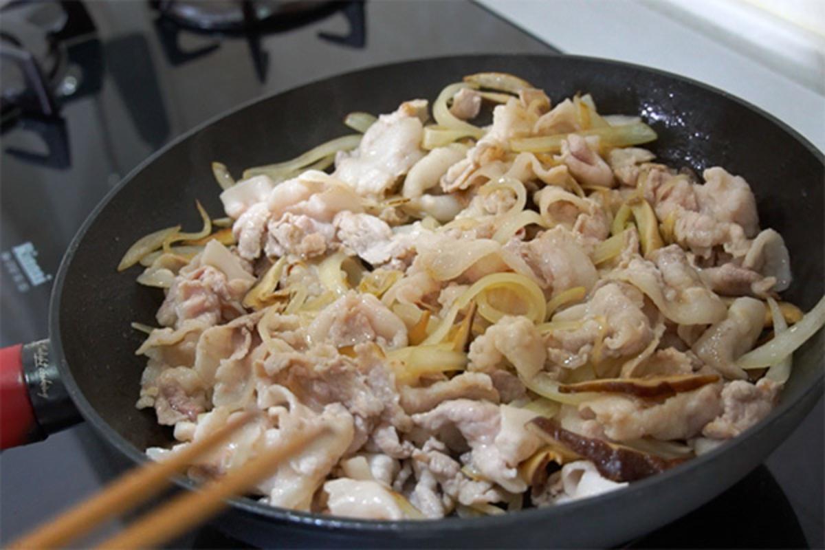 熱鍋後將香菇與洋蔥炒香炒軟。