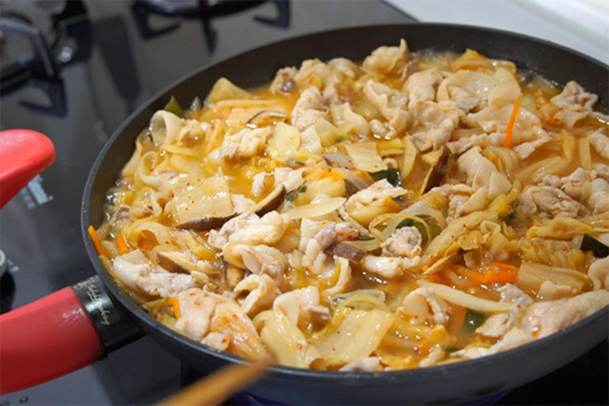 加入泡菜拌炒,並加入一開始的「香菇水」,將所有食材燉煮個5分鐘,將味道融合,關火備用。