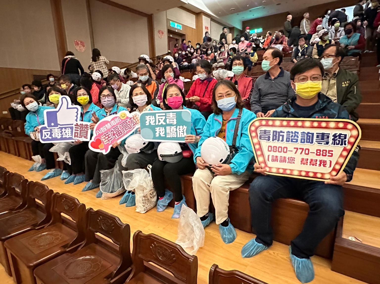 局長林瑩蓉頒發「里辦毒品防制關懷站」站牌予里長主席黃文良等86位里長,毒防局也提供反毒雄讚安全帽,大家戴上安全帽一起宣誓反毒,隨即進行毒品防制宣導衛教。