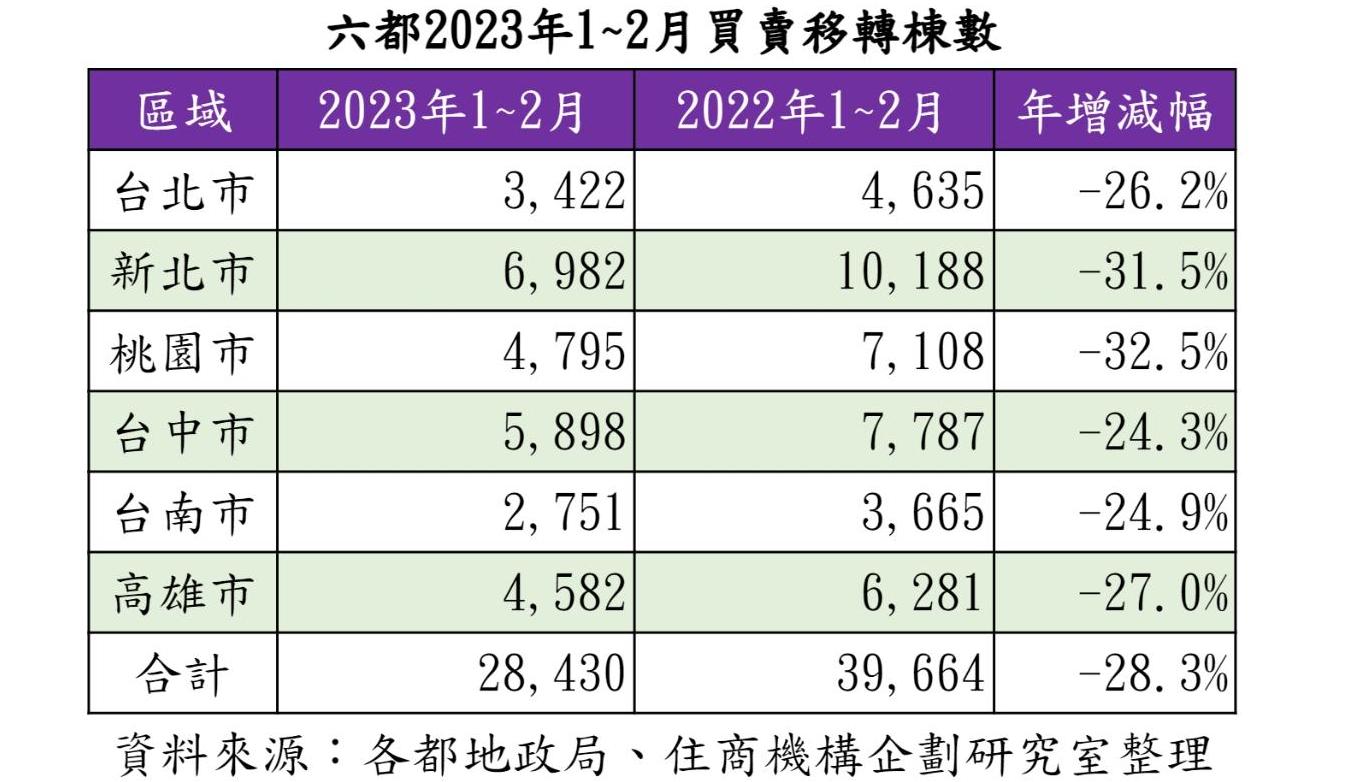根據六都最新買賣移轉資料顯示,前兩月六都建物買賣移轉棟數為2.8萬棟,年減28%,六都的表現一致,年減幅度在24%~33%。台北市前2月移轉棟數3422棟,年減26%;新北前2月移轉棟數6982棟,年減31%;桃園市前2月移轉棟數4795棟,年減33%;台中市前2月移轉棟數5898棟,年減24%;台南市前2月移轉棟數2751棟,年減25%;高雄市前2月移轉棟數4582棟,年減27%。