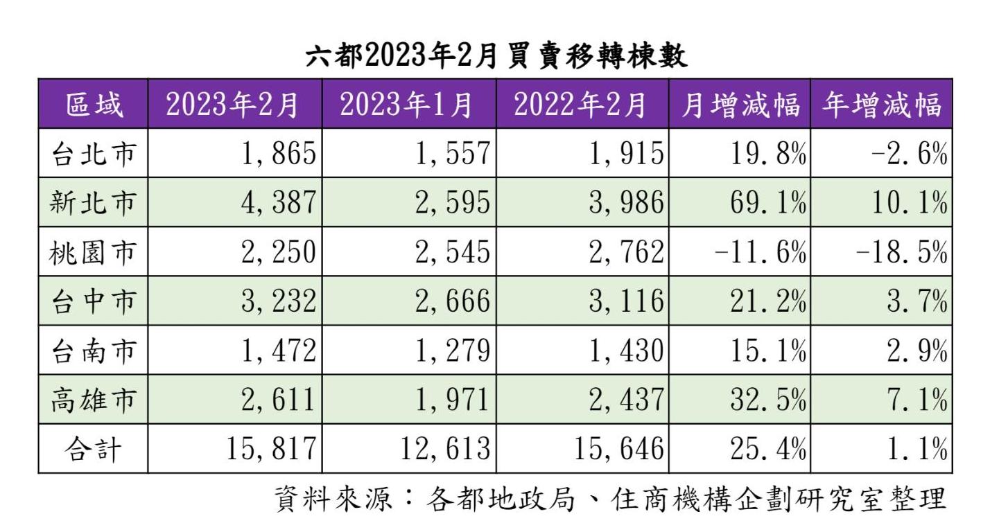 六都地政局1日公布2月份買賣移轉棟數,六都共計15,817棟,月增25.4%、年增1.1%,單看今年2月份買賣移轉棟數,新北市及台中市以南三都頗有回暖跡象,但總計今年1~2月買賣移轉棟數,六都共計28,430棟,跟去年同期相比大幅衰減28.3%,1~2月六都全面衰退。