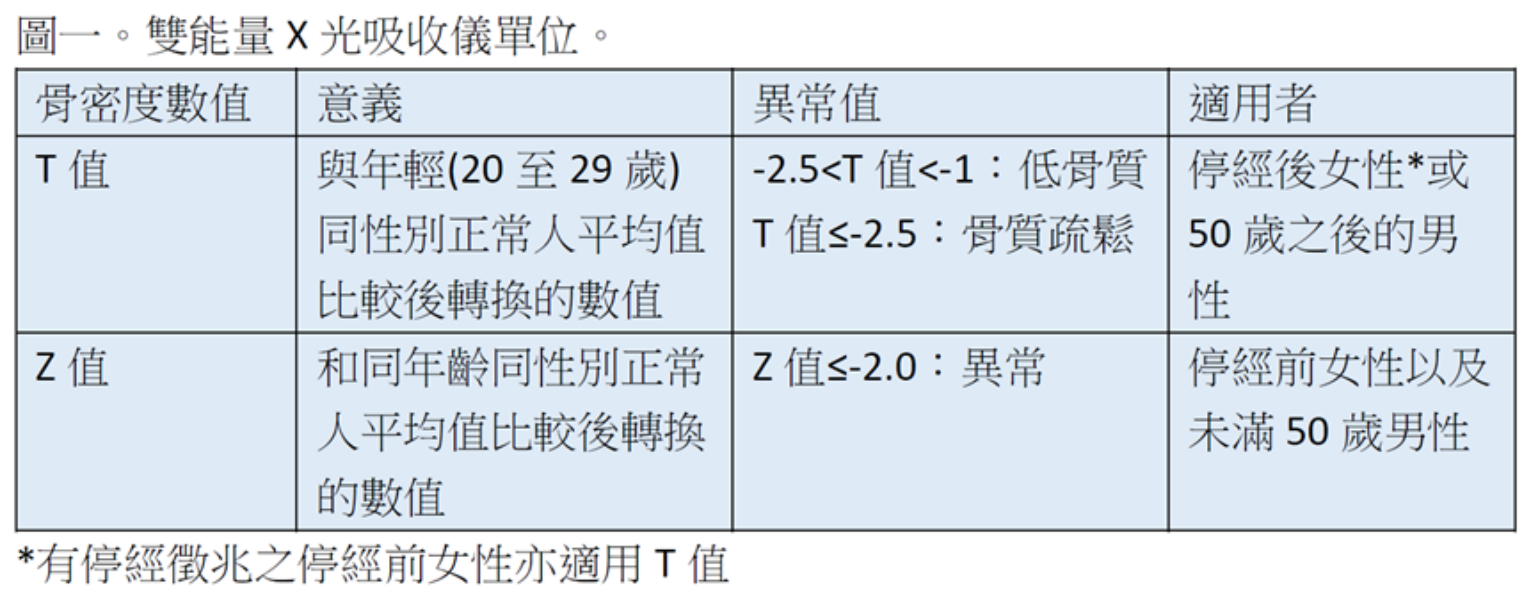 要診斷骨鬆,世界衛生組織唯一認可的骨密度診斷儀器是雙能量X光吸收儀(DXA),分成T值和Z值兩種數字(圖一)。T值用來診斷骨質疏鬆症,而Z值用來輔助診斷。當病人在非好發骨鬆的年齡被檢測出Z值下降(≤-2.0),或是有低創傷性骨折病史,都應考慮是否有次發性原因存在。