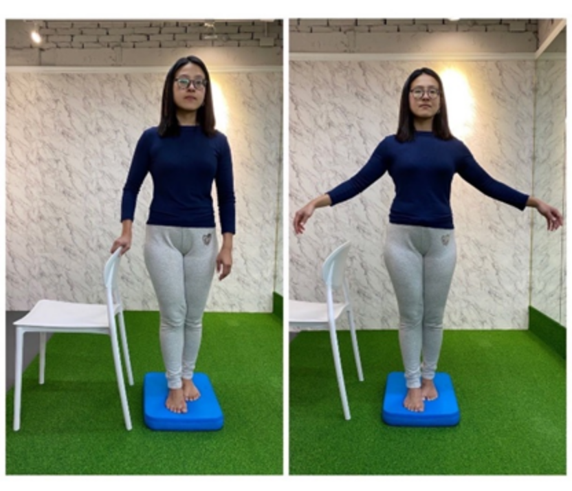 1.首先握住椅子,再站至平衡墊上,一腳大腳趾側邊靠攏至另一站立腳足弓旁
