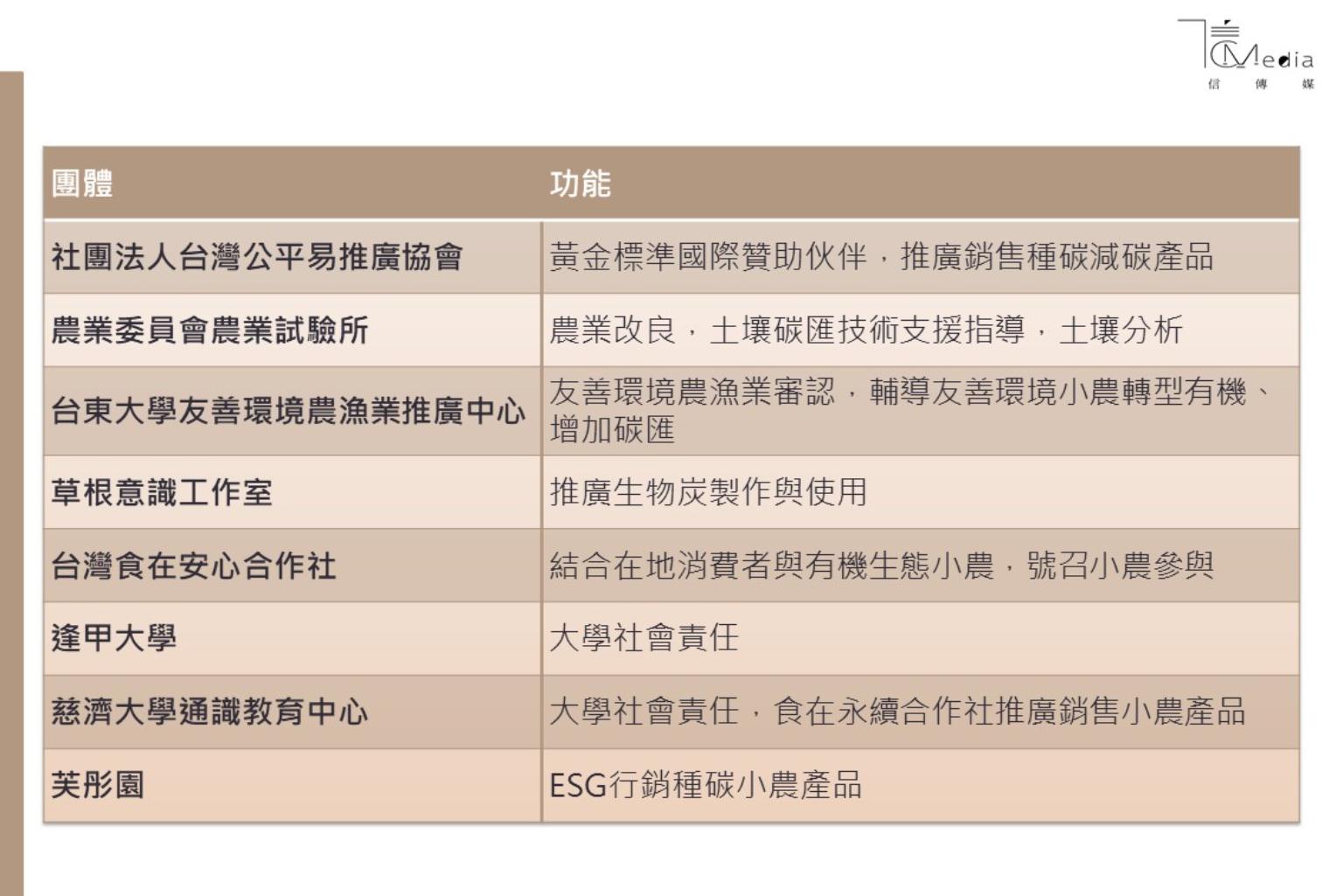 小農種碳並非一個企業能夠單獨執行的,需要社會各界的協助,目前已有8個單位是第一階段的協力伙伴團體,如果沒有伙伴團體的協助,則無法獲得第一步的成就。