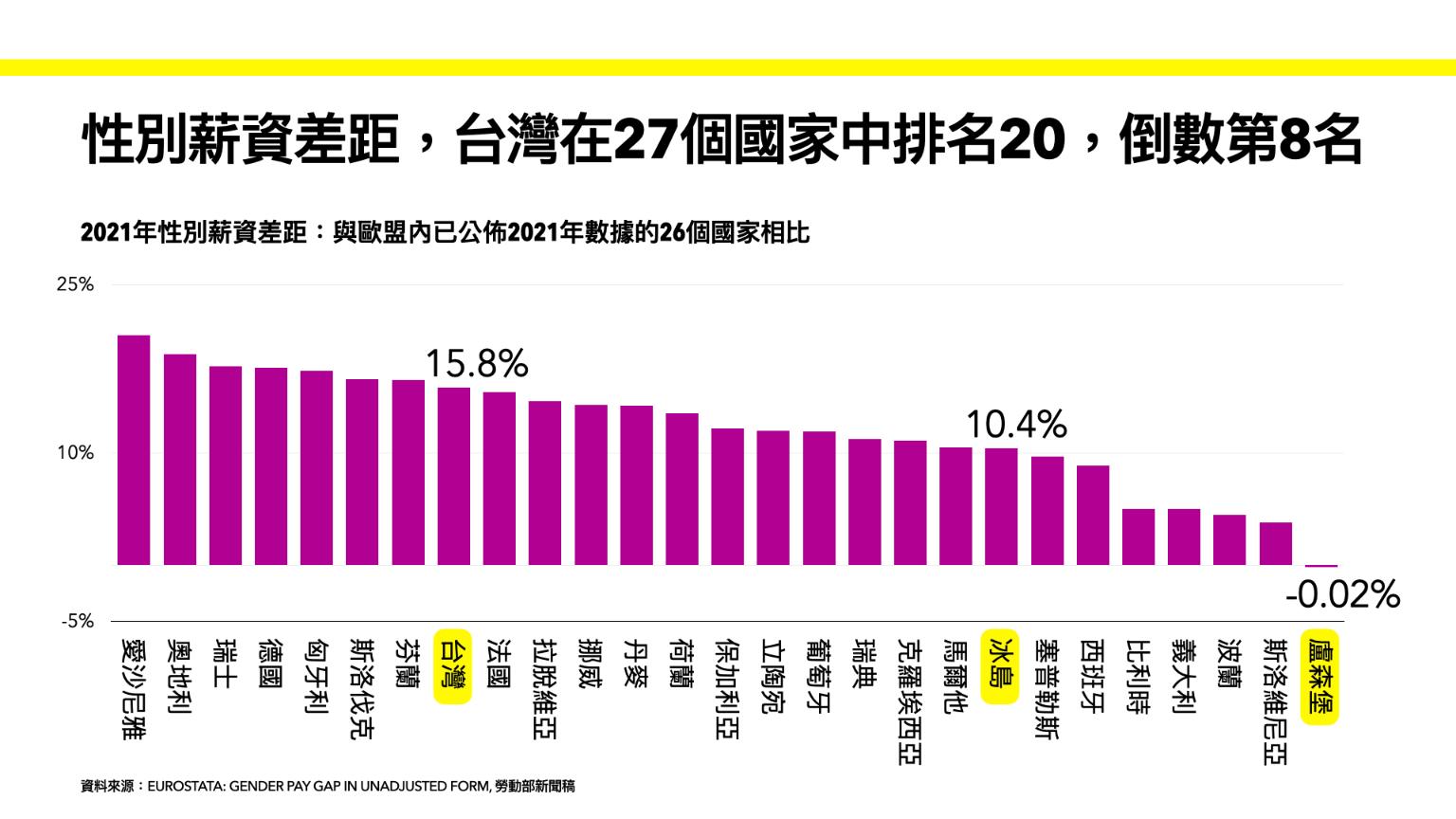 陽明交通大學科技法律研究所副教授邱羽凡批評,政府每年公布性別薪資差距,都刻意拿美日韓這些比我們性別不平等的國家來自我感覺良好,實際上歐盟的兩性薪資差距是10.3%,比利時更只有3.79%,只看日本、韓國的兩性薪資差距為30%,不只彰顯政府沒有正視台灣還有薪資不平等的存在,也不能帶動台灣政策的進步。