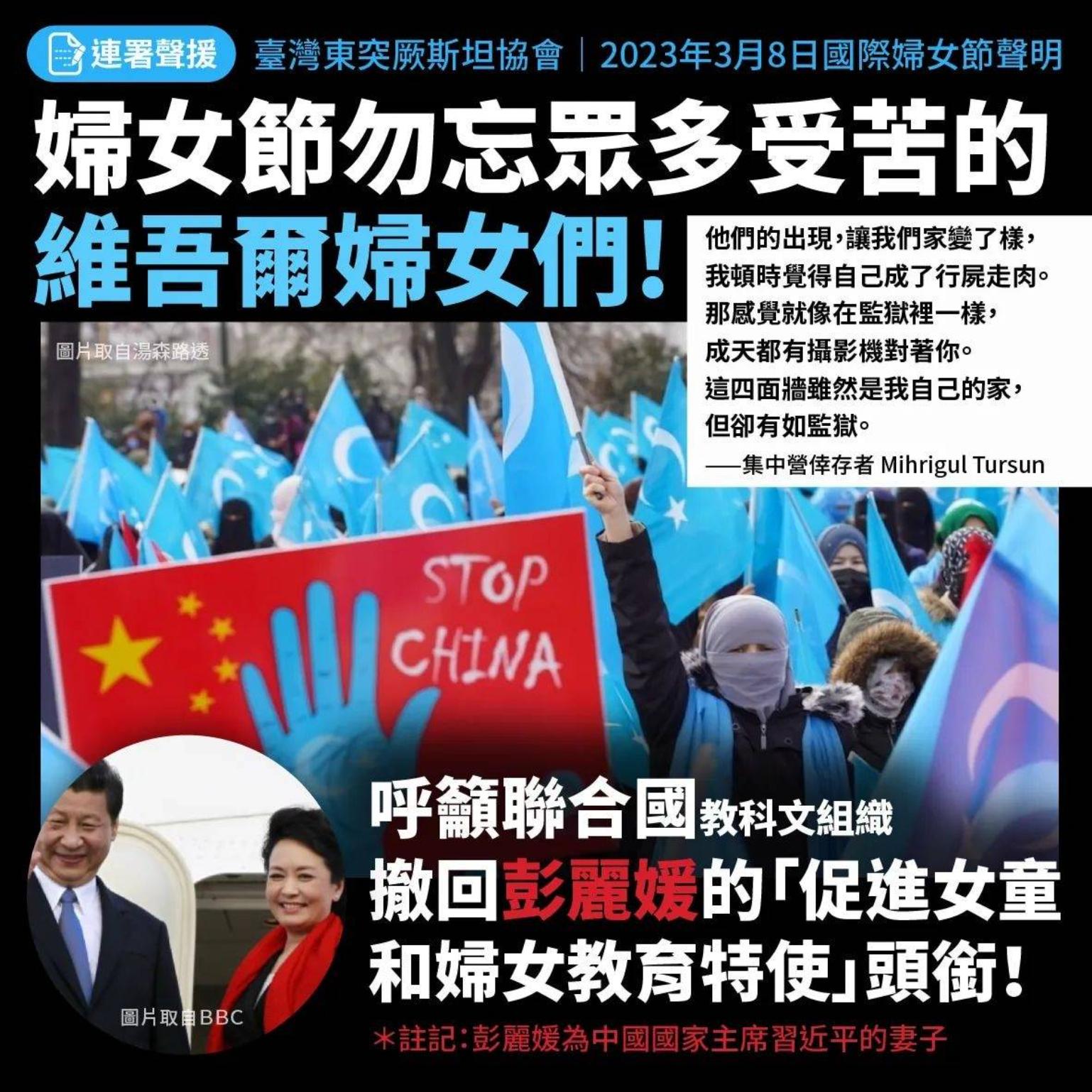勿忘眾多受苦的維吾爾婦女們,臺灣東突厥斯坦協會(下簡稱東突協會)呼籲聯合國,撤回彭麗媛的「促進女童和婦女教育特使」頭銜。