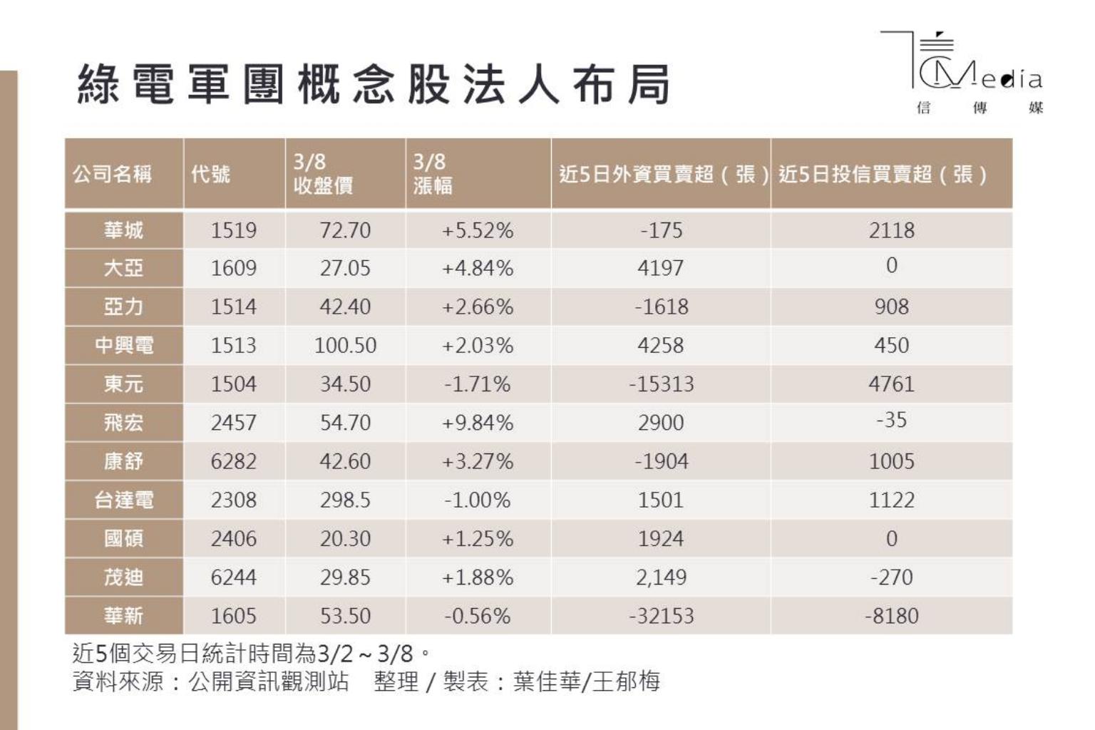 另外,近日股價攻上百元大關、創下歷史新高的中興電(1513),近5個交易日外資與投信則同步站在買方,累計分別買超4258及450張;而儲能族群之一的台達電(2308)近5個交易日外資與投信也同樣站在買超,分別敲進1501、1122張,「綠能軍團」利多再起。