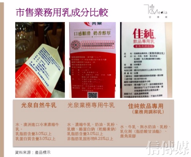《信傳媒》編輯團隊走訪多家知名連鎖飲料店與便利商店,發現這些商家販售乳製品飲料使用的鮮乳多數是「業務用乳」。細看業務用乳的成分標示與一般市售鮮乳有差異。一般國產鮮乳的主要成分為生乳,而「業務用乳」主要成份除了水之外,還有濃縮牛乳、奶粉、無水奶油等,而非百分之百的生乳。