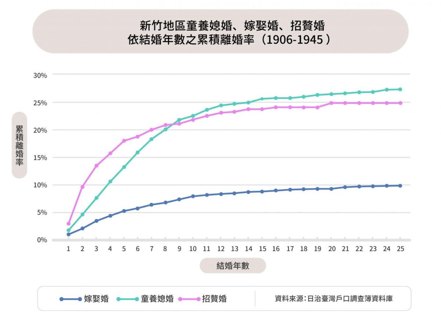 雖然童養媳婚的婚後生活起頭難,但夫妻離異的佔比在一開始並不是最高。以新竹地區 1906 至 1945 年戶口資料統計的離婚率為例,婚後 8 年內,招贅婚的離婚率最高、童養媳婚次之、嫁娶婚則最低。但從結婚第 9 年後直到統計結束的第 25 年,童養媳婚的離婚率已躍居三者之中最高。