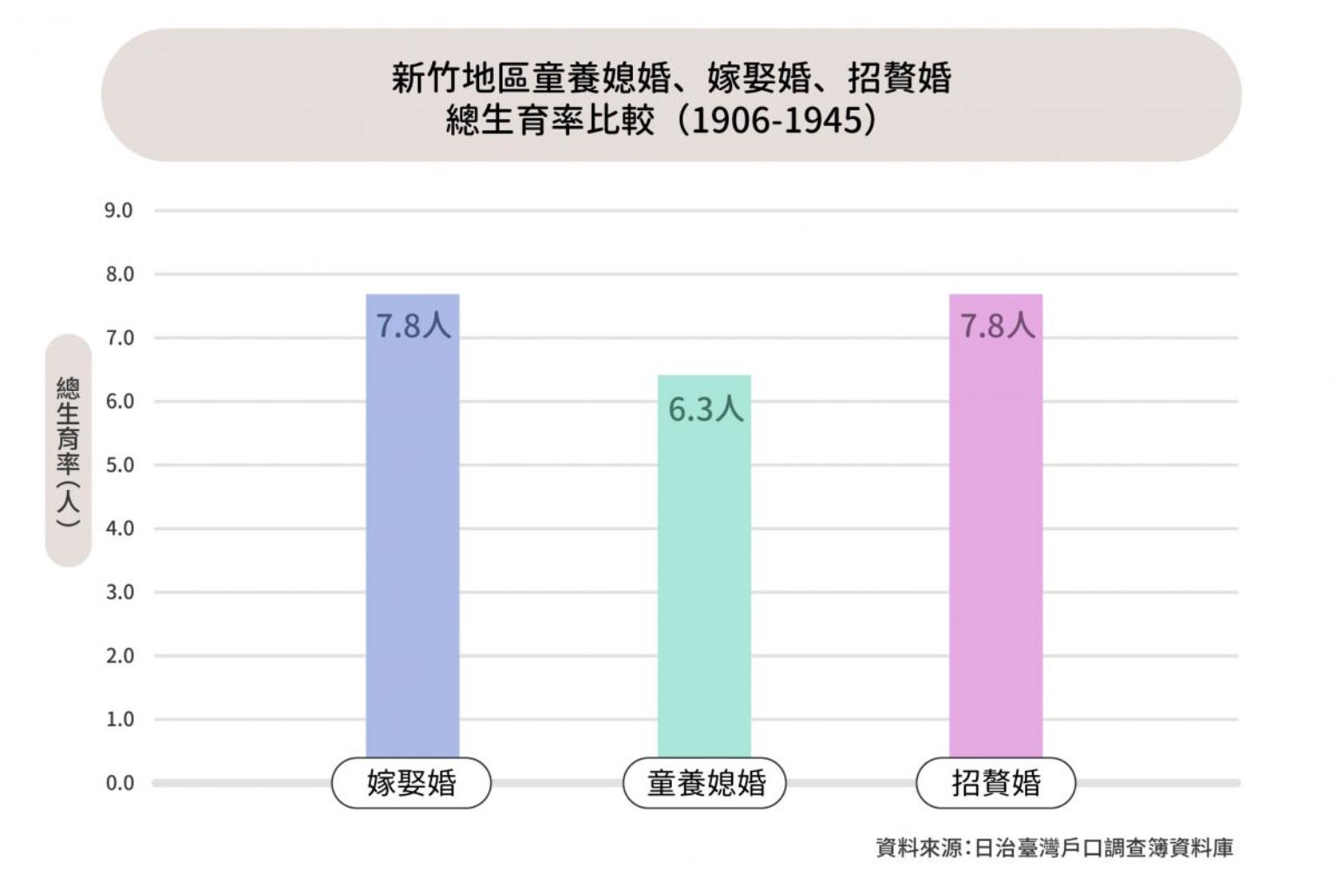 另外,童養媳婚的生育率普遍比其他婚姻型態低。以新竹地區 1906 至 1945 年戶口資料統計的總生育率為例,嫁娶婚、招贅婚平均生育 7.8 名子女,童養媳婚平均僅生育 6.3 名子女。