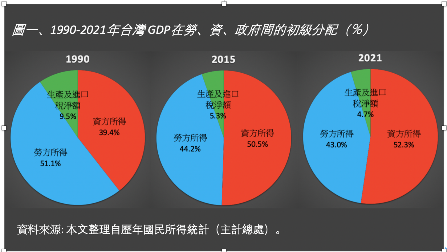 圖一呈示1990年、2015年與2021年GDP在勞方、資方與政府三者間的分配結構(即所謂的「初級分配」)。政府以「生產與進口稅淨額」形式參與分配,而「營業盈餘與綜合收入毛額」(含房地產租金收入)約可代表資方所得,勞方所得為上述的「受僱人員勞動報酬」。從圖中可清楚看出,過去四十年間勞方所得占比縮水了八個百分點,政府份額萎縮了近五個百分點,唯獨資方所得從原本不足四成,大幅躍進至今創下歷史新高(52.3%)。
