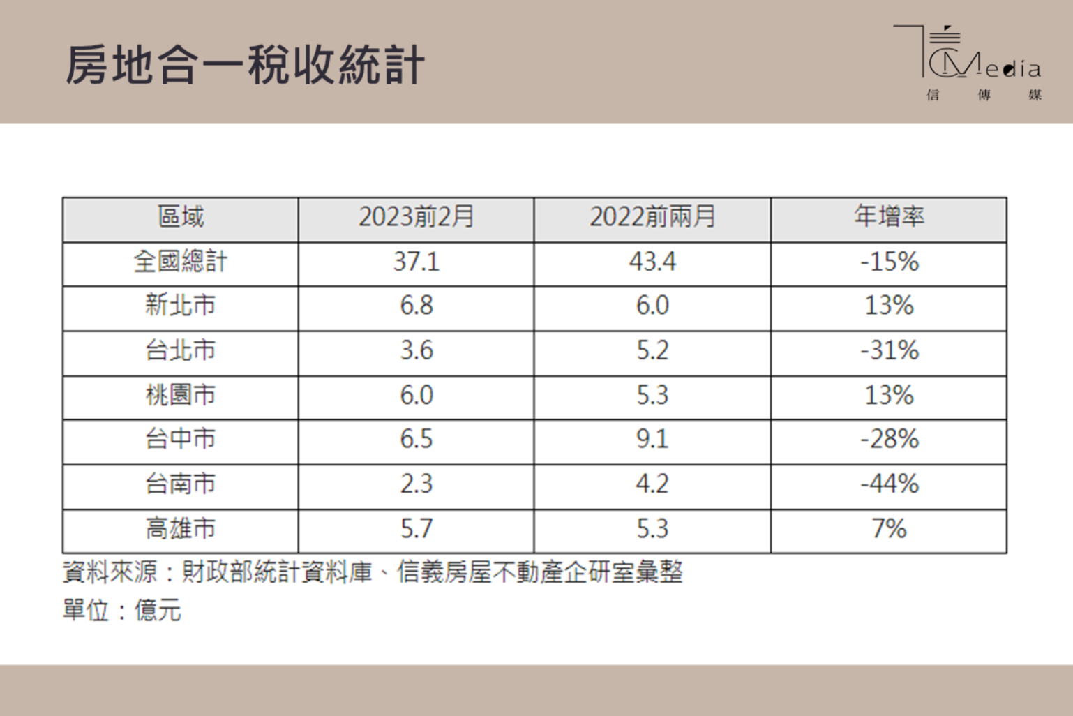 根據財政部統計資料庫資料顯示,今年全國前2月房地合一稅收為37.1億元,終於較去年同期呈現衰退表現,年減幅度為15%,過去一年即使房市交易量縮,不過房地合一都維持年增表現,不過隨市場交易降溫,加上去年房地合一稅基期已高,前兩月也出現罕見的年減表現。