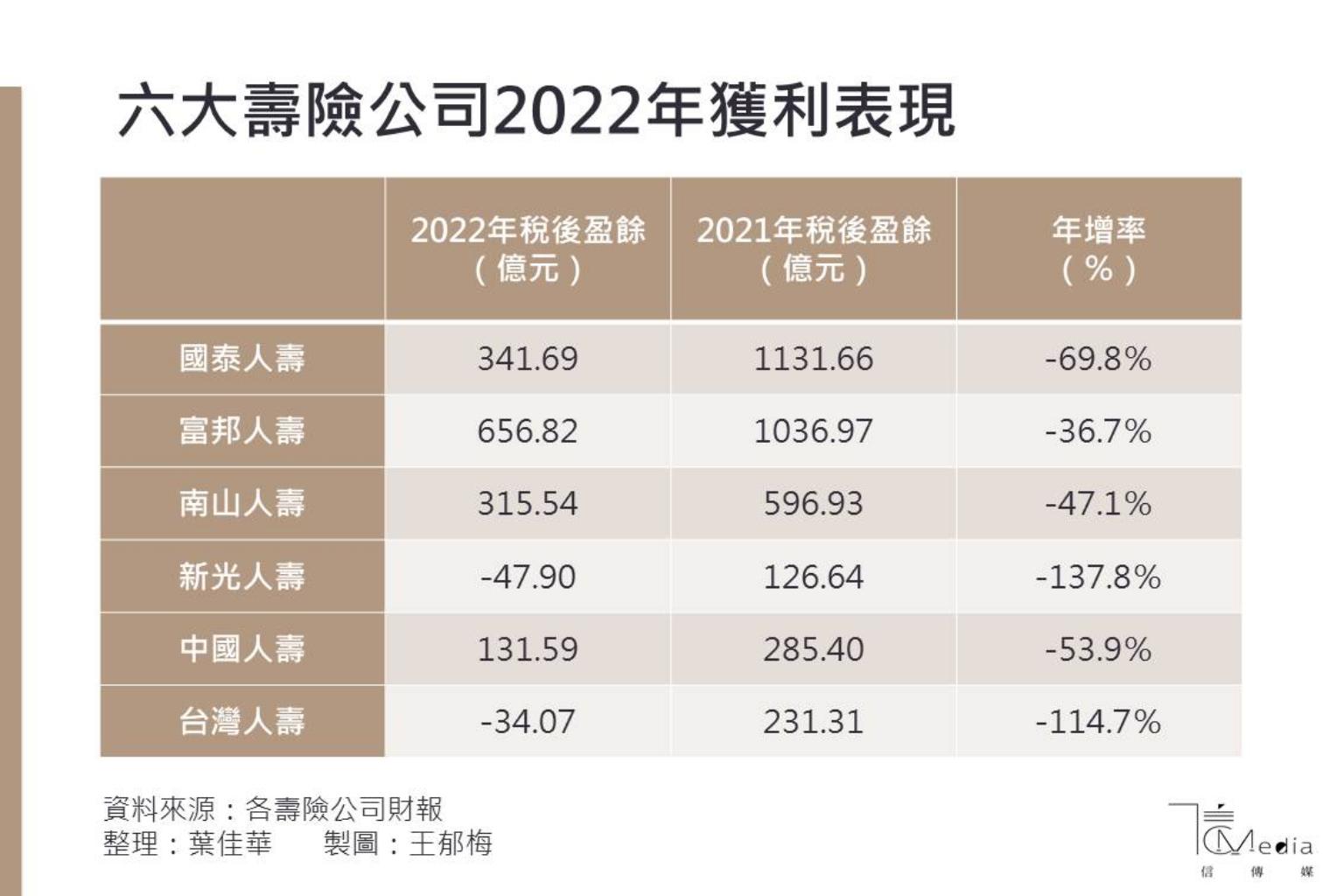隨著各家壽險公司已全數公告去年財報,從資產排名國內前六大的國泰人壽、富邦人壽、南山人壽、新光人壽、中國人壽及台灣人壽來看,六大壽險公司的去年獲利清一色都是大衰退,其中,富壽衰退36.7%、南山則衰退47%、中壽獲利也腰斬、國壽則是衰退近7成,而新壽、台壽更是罕見出現全年稅後虧損。