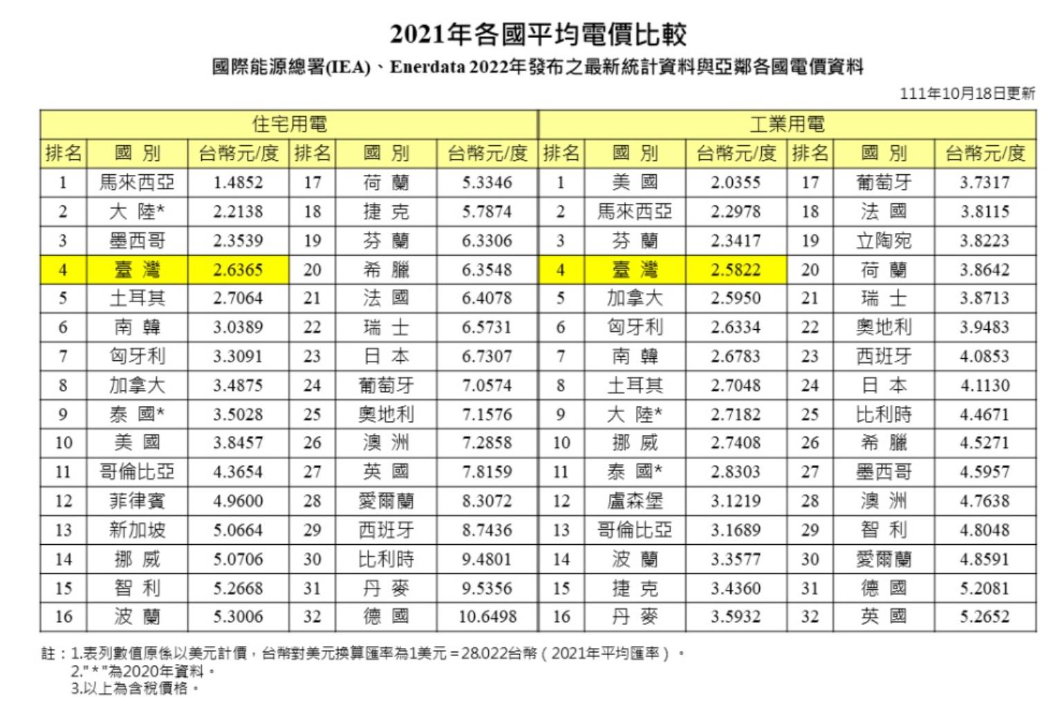 且台灣的工業電價長期以來低於主要生產大國(附件一),在全球各國紛紛調漲電價的趨勢下,本次調漲後仍低於多數競爭者。因此我們認為,電價調漲將迫使企業出走的說法,顯然為誇大其詞。