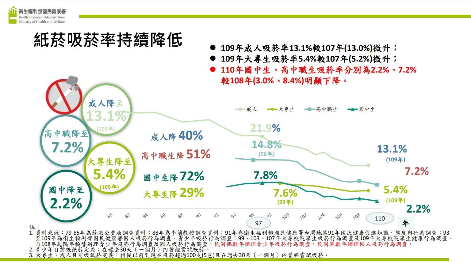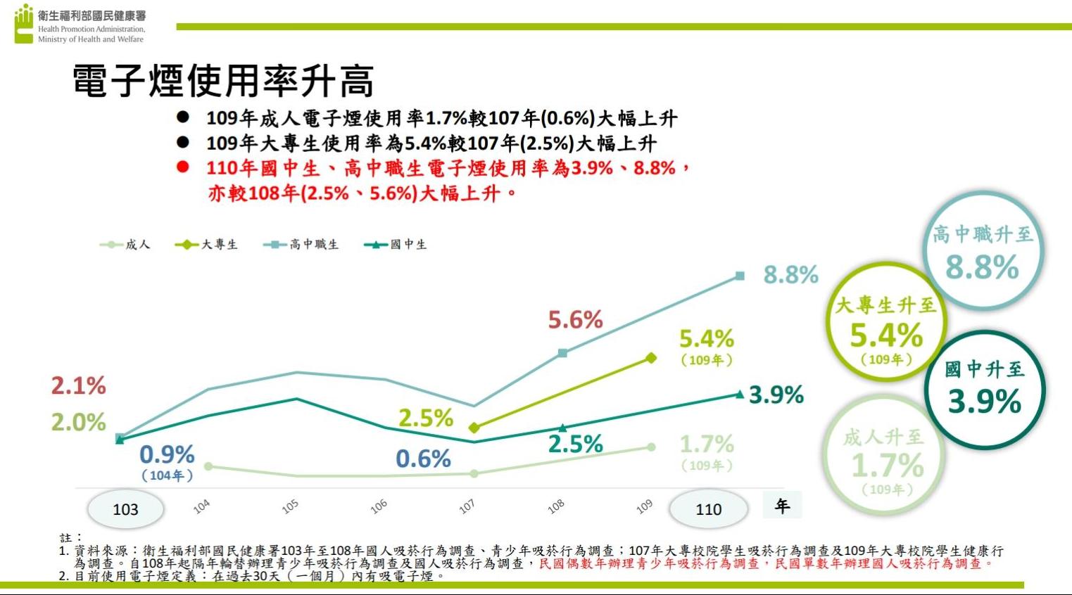 根據國健署資料統計,110年國中生使用電子煙的比例從108年的2.5%升到3.9%,而高中生使用電子煙的比例從108年的5.6%升到了8.8%。而110年國中生使用傳統紙菸的比例從108年的3%下降至2.2%,而高中生使用傳統紙煙的比例從108年的8.4%下降到7.2%。明顯指出紙菸的吸菸率在持續下降,而電子煙的吸菸率在持續上升。