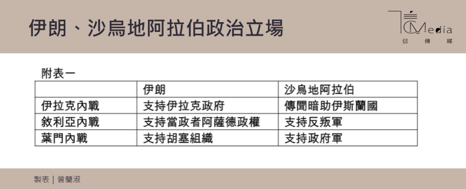 兩國為爭奪波斯灣國家的霸主,將戰場延伸到伊拉克、敘利亞與葉門(見表一)。這些國家內戰的原因,都有教派衝突的身影,由於伊朗與沙烏地阿拉伯介入的代理人戰爭,更是讓內戰難以收拾的主因。